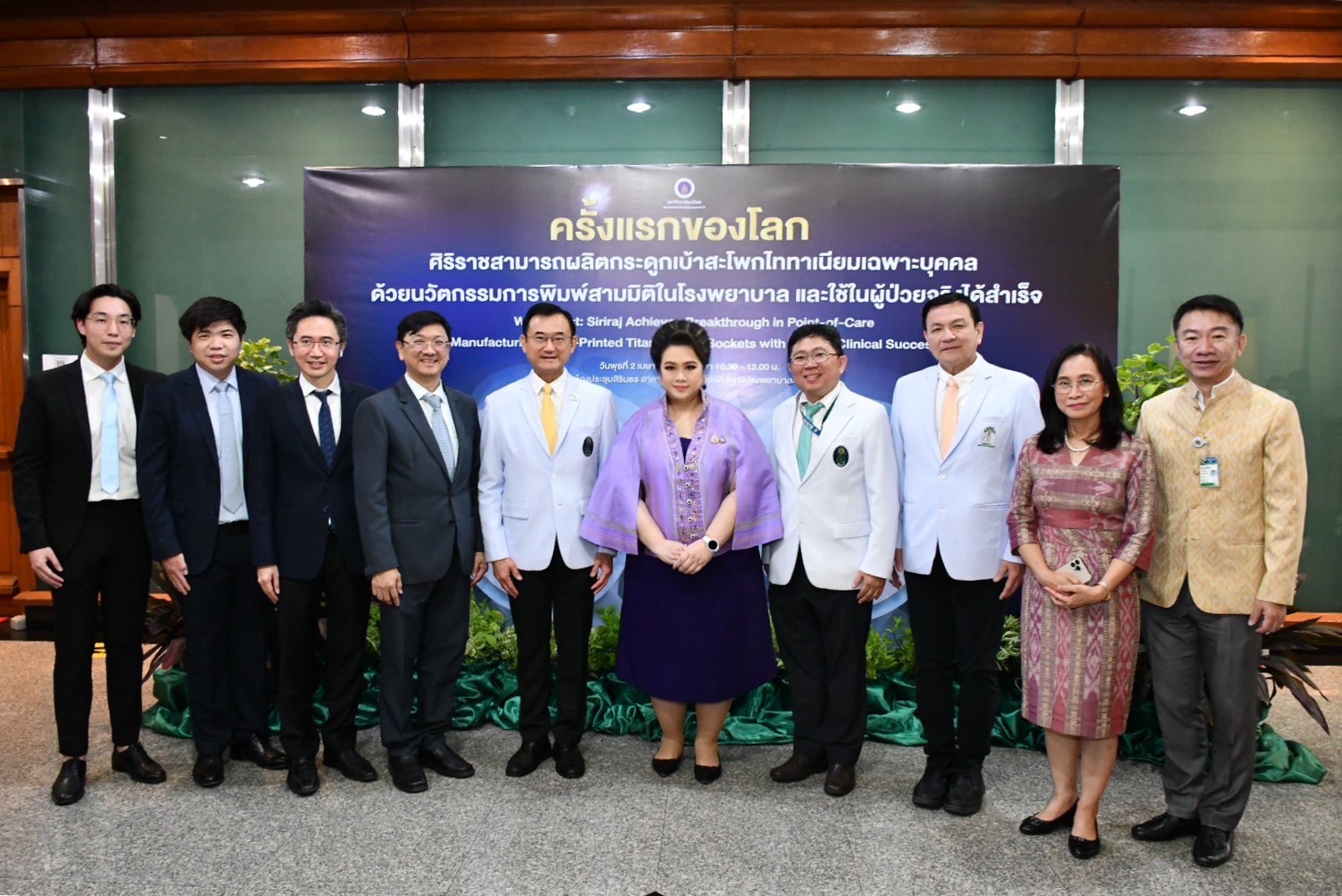 2 เม.ย. 2568 – ศ. นพ.อภิชาติ อัศวมงคลกุล คณบดีคณะแพทยศาสตร์ศิริราชพยาบาล ม.มหิดล เป็นประธานในงานแถลงข่าวครั้งแรกของโลก ศิริราชสามารถผลิตกระดูกเบ้าสะโพกไทเทเนียมเฉพาะบุคคล ด้วยนวัตกรรมการพิมพ์สามมิติในโรงพยาบาล และใช้ในผู้ป่วยจริงได้สำเร็จ (World First: Siriraj Achieves Breakthrough in Point-of-Care Manufacturing of 3D-Printed Titanium Hip Sockets with Proven Clinical Success) โดยมี คุณศุภมาส อิศรภักดี รัฐมนตรีว่าการกระทรวงการอุดมศึกษา วิทยาศาสตร์ วิจัยและนวัตกรรม รศ. ดร.ยศชนัน วงศ์สวัสดิ์ รองอธิการบดีฝ่ายวิจัย ม.มหิดล รศ. นพ.ธีระ กลลดาเรืองไกร ผู้อำนวยการศูนย์การแพทย์กาญจนาภิเษก คณะแพทยศาสตร์ศิริราชพยาบาล ม.มหิดล ศ. นพ.กีรติ เจริญชลวานิช หัวหน้าภาควิชาศัลยศาสตร์ออร์โธปิดิคส์และกายภาพบำบัด คณะแพทยศาสตร์ศิริราชพยาบาล ม.มหิดล พร้อมด้วย รศ. ดร.ธงชัย สุวรรณสิชณน์ ผู้อำนวยการหน่วยบริหารและจัดการทุนด้านการเพิ่มความสามารถในการแข่งขันของประเทศ (บพข.) และ ผศ. ดร.เชษฐา พันธ์เครือบุตร หัวหน้าโครงการฯ บริษัท ออส ทรีโอ จำกัด ร่วมงาน ณ ห้องประชุมสิรินธร อาคารเฉลิมพระเกียรติ ชั้น G โรงพยาบาลศิริราช