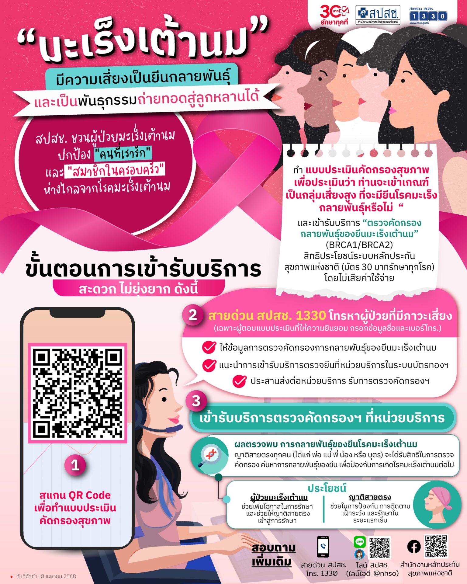 ทพ.อรรถพร กล่าวต่อว่า ในปี 2568 นี้ สปสช. ยังคงให้บริการสิทธิประโยชน์ตรวจคัดกรองเพื่อค้นหาการกลายพันธุ์ของยีนโรคมะเร็งเต้านม BRCA1/BRCA2 โดยมีเป้าหมายจำนวน 6,870 คน และมีผู้ป่วยมะเร็งเต้านมที่มีความเสี่ยงสูงและญาติสายตรงเข้ารับบริการตรวจคัดกรองค้นหาการกลายพันธ์โรคมะเร็งเต้านมแล้ว จำนวน 2,897 ราย คิดเป็นร้อยละ 42.16 ข้อมูล ณ วันที่ 15 มีนาคม 2568 ดังนั้นจึงขอเชิญชวนผู้ป่วยมะเร็งเต้านมที่มีความเสี่ยงสูง และญาติสายตรงที่มีประวัติครอบครัวตรวจพบยีนกลายพันธุ์ ซึ่งเป็นคนไทยอายุ 18 ปีขึ้นไป ทุกสิทธิการรักษา จัดทำแบบประเมินคัดกรองสุขภาพเพื่อประเมินความเสี่ยงและการรับสิทธิตรวจคัดกรองยีน BRCA1/BRCA2 และเข้ารับบริการตรวจฯ เพื่อค้นหาและเพิ่มโอกาสรักษาให้กับผู้ที่มีภาวะเสี่ยงต่อโรคมะเร็งเต้านม
