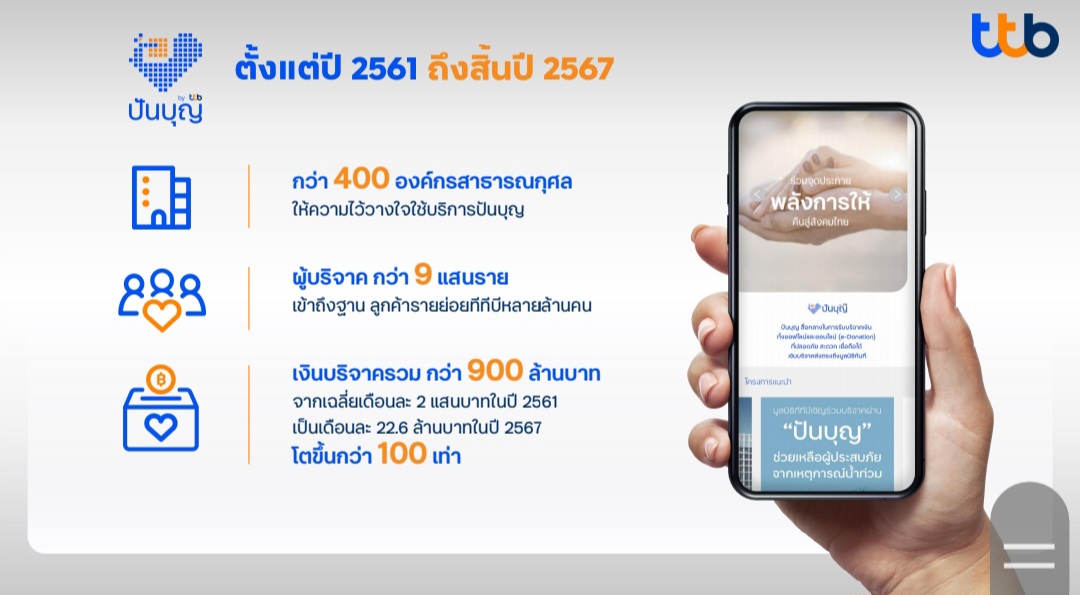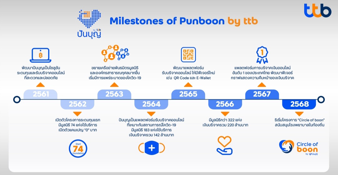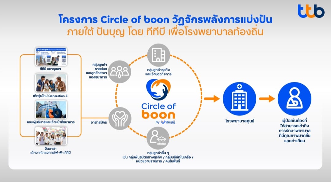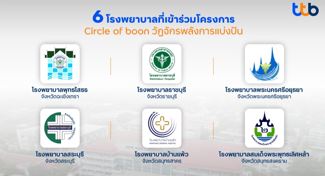 ด้วยเหตุนี้ ทีทีบี (ttb) หรือ ทีเอ็มบีธนชาต ตระหนักถึงบทบาทของภาคการเงินในการเป็นพลังร่วมสร้างสังคมที่ยั่งยืน จึงเดินหน้าพันธกิจธนาคารเพื่อความยั่งยืน ผ่านโครงการ “Circle of Boon วัฏจักรพลังการแบ่งปัน” บนแพลตฟอร์มปันบุญ ที่มุ่งเน้นการขยายพลังการให้ ด้วยความร่วมมือจากทุกภาคส่วน ไม่ว่าจะเป็นบุคคลทั่วไป ธุรกิจ หรือองค์กร เพื่อระดมทุนและบริจาคสนับสนุนเครื่องมือแพทย์และอุปกรณ์จำเป็นให้แก่โรงพยาบาลท้องถิ่นนำร่อง 6 แห่ง ที่เข้าร่วมโครงการ ประกอบด้วย โรงพยาบาลสระบุรี โรงพยาบาลพระนครศรีอยุธยา โรงพยาบาลพุทธโสธร โรงพยาบาลราชบุรี โรงพยาบาลบ้านแพ้ว และโรงพยาบาลสมเด็จพระพุทธเลิศหล้า