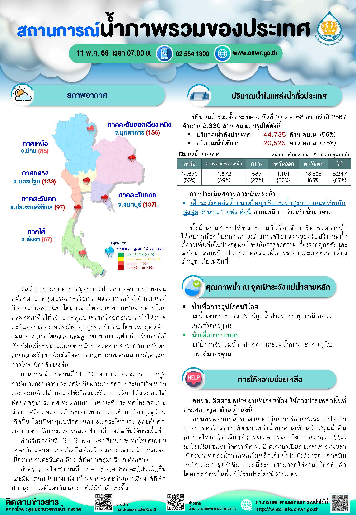 11 พ.ค.2568-สถาบันทรัพยากรน้ำแห่งชาติ (สทนช.) รายงานสถานการณ์น้ำภาพรวมของประเทศ วันที่ 11 พ.ค. 68 เวลา 7.00 น.ว่า1. ปริมาณฝนสะสม 24 ชม. สูงสุด ได้แก่ ภาคเหนือ : จ.น่าน (85 มม.) ภาคตะวันออกเฉียงเหนือ : จ.มุกดาหาร (156 มม.) ภาคกลาง : จ.นครปฐม (133 มม.) ภาคตะวันออก : จ.จันทบุรี (137มม.) ภาคตะวันตก : จ.ประจวบคีรีขันธ์ (97มม.) ภาคใต้ : จ.พังงา (67มม.)