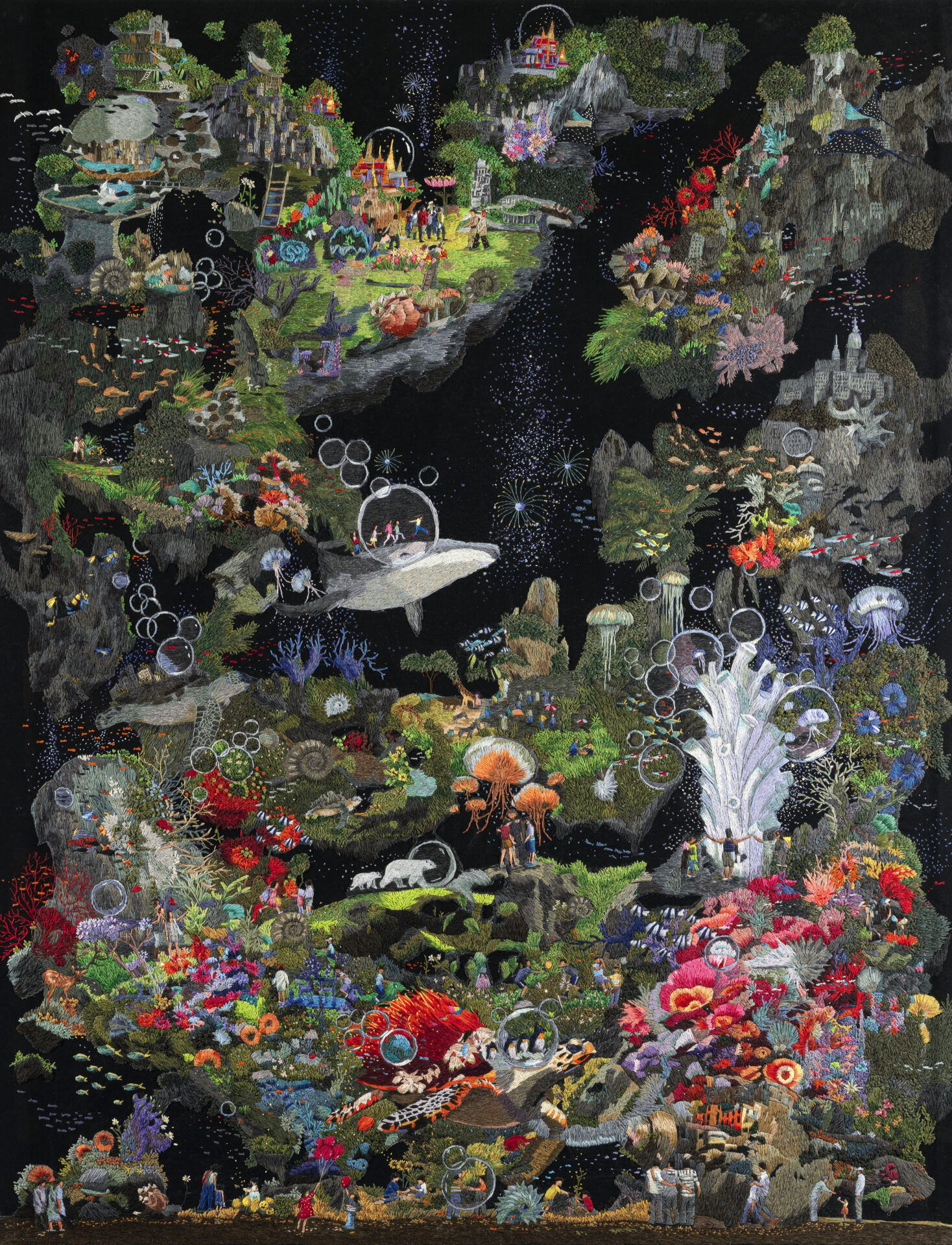 เญอรินดา แก้วสุวรรณ รางวัลชนะเลิศจากผลงาน “Waterworld” เทคนิคเย็บปักถักร้อย กล่าวว่า ผลงาน สะท้อนถึงวัฏจักรน้ำที่มีการเปลี่ยนแปลง ส่งผลกระทบต่อเศรษฐกิจ สิ่งแวดล้อม ระบบนิเวศ แรงบันดาลใจจากการไปดำน้ำเห็นแนวปะการังเสื่อมโทรมจากปะการังฟอกขาว เสนอผ่านมุมมองใหม่ปรับเปลี่ยนวัฏจักรของสิ่งมีชีวิตที่อยู่อาศัยทั้งบนบก ขั้วโลกเหนือ และสิ่งแวดล้อม มาไว้ในน้ำ ทำให้เป็นโลกใต้น้ำ มีการพึ่งพิงโอบอุ้มซึ่งกันและกัน ใช้น้ำเป็นตัวเชื่อมความสัมพันธ์ เพราะน้ำเป็นส่วนสำคัญในการใช้ชีวิต อยากให้ทุกคนที่เห็นผลงานชิ้นนี้ตระหนักถึงคุณค่าของน้ำ หันกลับมาดูแลเอาใจใส่ธรรมชาติและระบบนิเวศรอบตัว