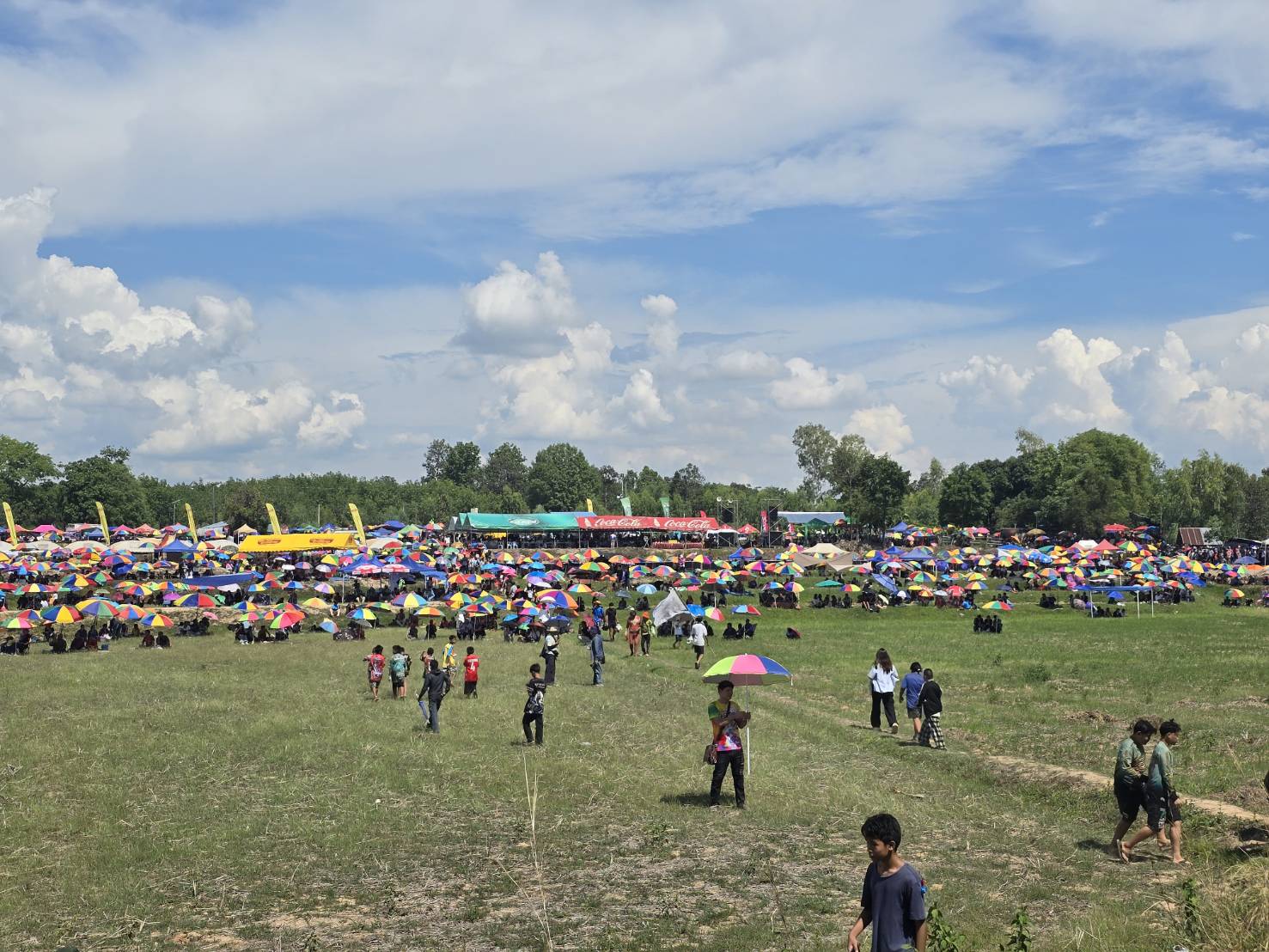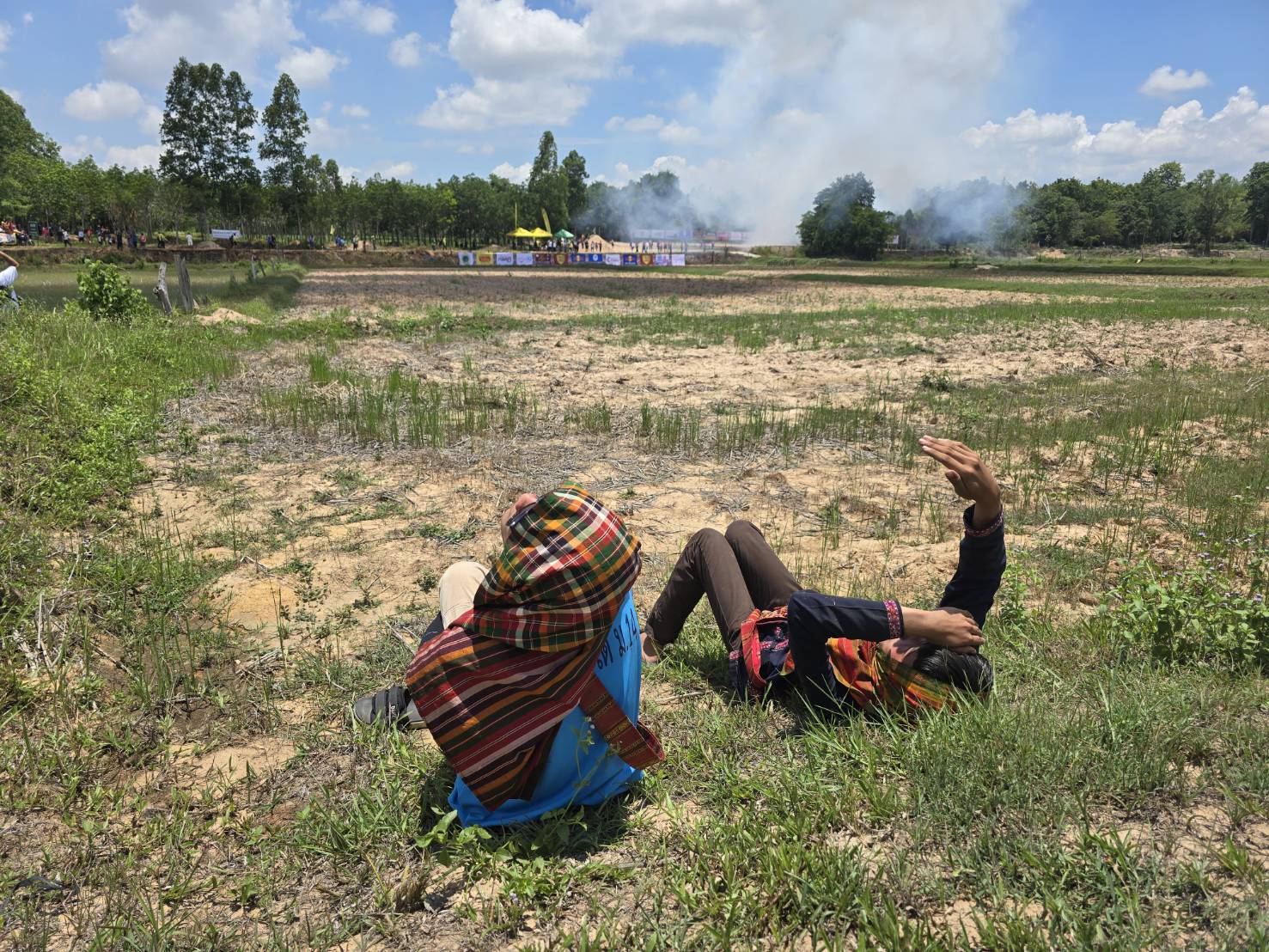 บริเวณลานจุดบั้งไฟถูกจัดเป็นแย่งเป็นโซน ทั้งโซนของทีมงาน โซนปลอดภัยสำหรับชม และแน่นอน โซนอันตรายสำหรับจุดบั้งไฟซึ่งผู้ไม่เกี่ยวข้องห้ามเข้าโดยเด็ดขาด ผืนนากว้างใหญ่ทักคนปักหลักหาทำเลนั้ง ร่ม 1 คัน เสื่อ 1 ผืนกลายเป็นพร็อพจำเป็นของงานนี้ ทุกคนต่างรู้หน้าที่ของตนเองดี โดยเฉพาะชาวบ้านที่เฝ้ารอชมกันมาทั้งปี หลายคนเลือกนั่งในจุดที่ใกล้พอจะมองเห็นชัด ๆ แม้จะรู้ว่าอาจไม่ปลอดภัยนัก แต่ก็พร้อมระวังตัวอย่างดี