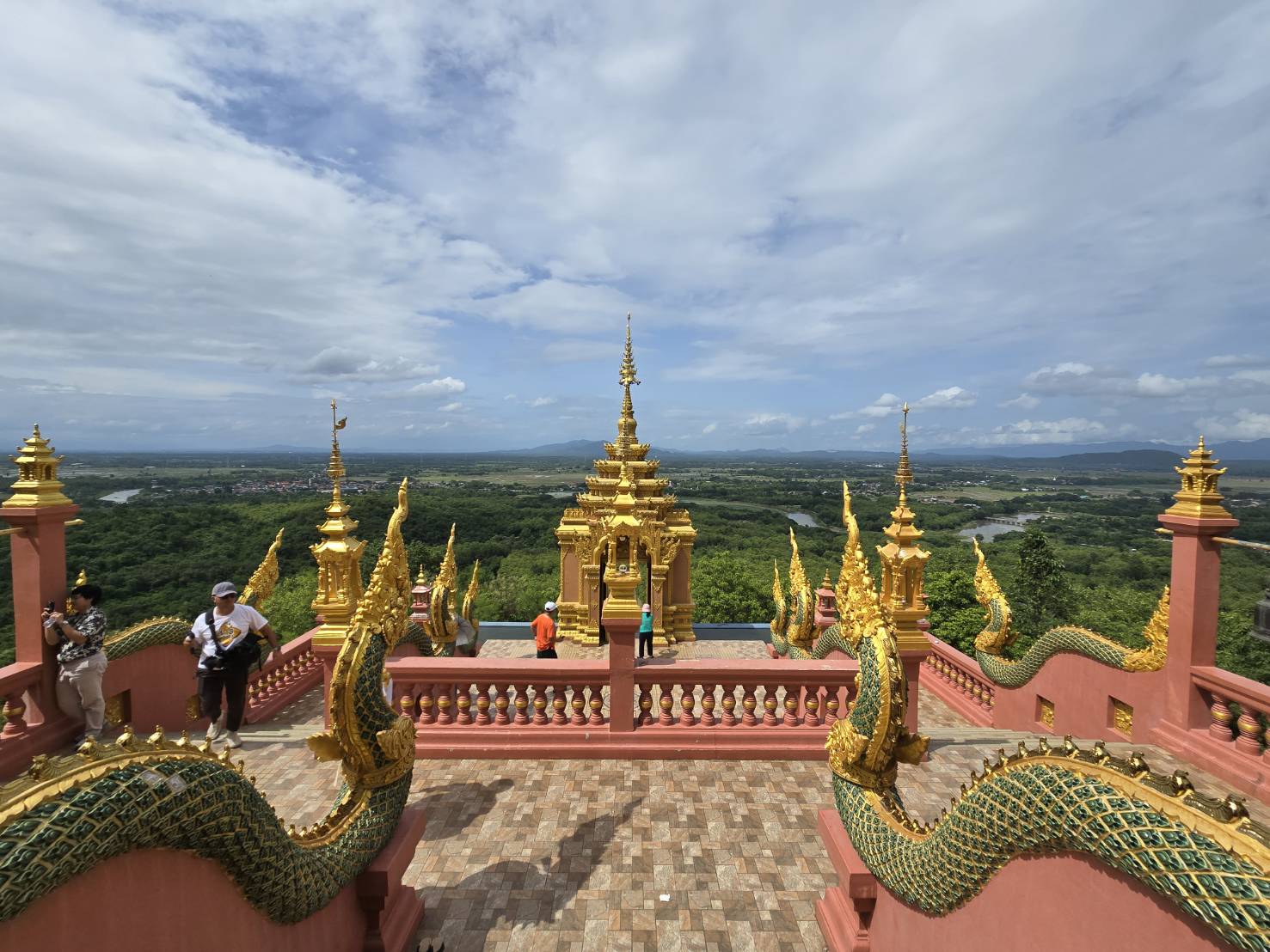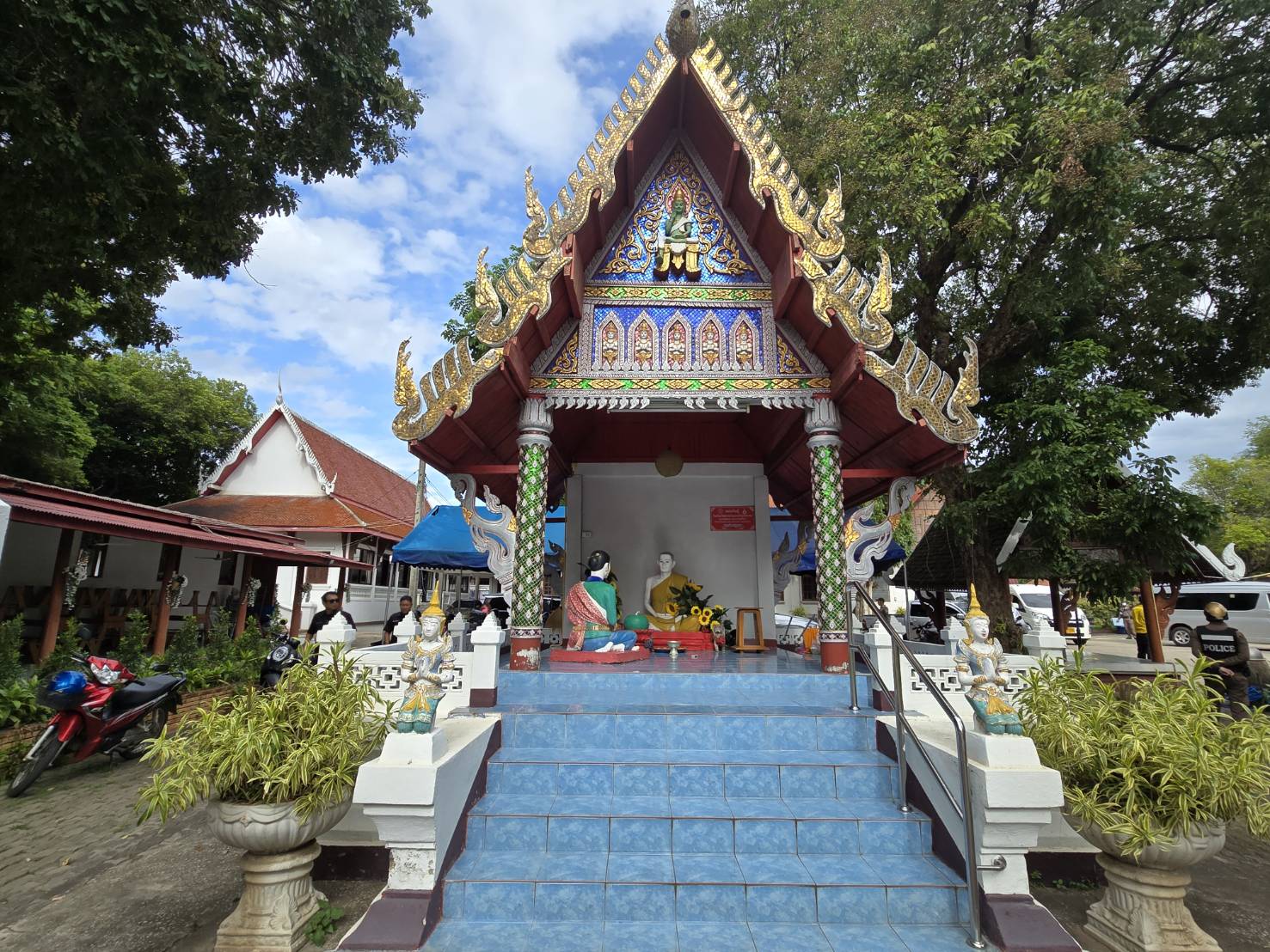 เดินต่อไปยัง วิหารสมเด็จองค์ปฐม โดยระหว่างทางแวะกราบขอพรที่ศาลา 5 พระองค์ และพระธาตุดอยพระฌาน จุดนี้มีมุมสวยให้แวะชมต้นโพธิ์สีทอง ประติมากรรมที่วิจิตรตระการตา ตกแต่งอยู่ด้านหลังของผนังวิหาร สะท้อนแสงแดดระยิบระยับ และมาชมวิวที่บันไดนาค มองเห็นเมืองแม่ทะได้แบบพาโนรามา