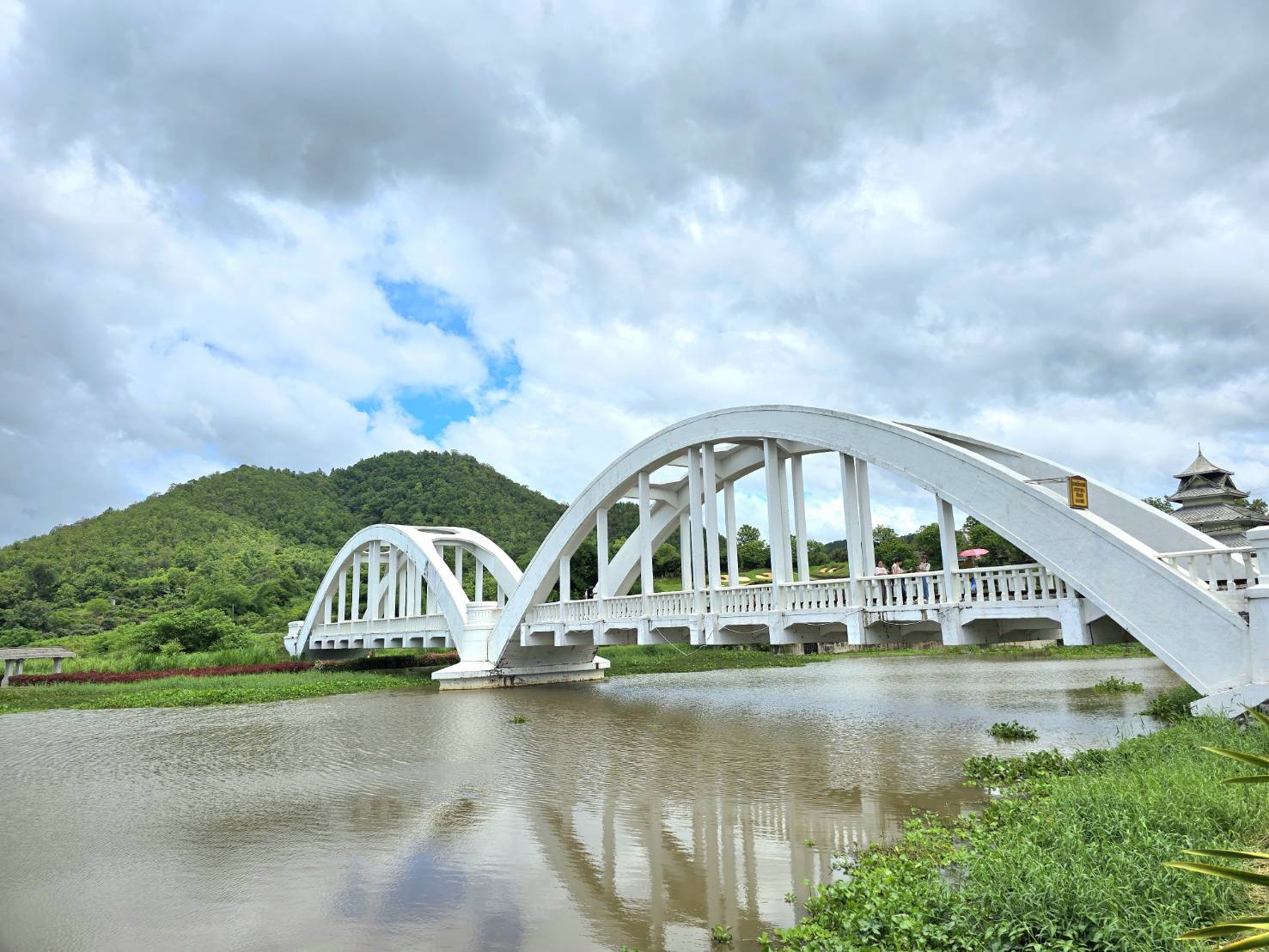 เดินทางต่อมายังมุมไฮไลท์ของลำพูน ในอ.แม่ทา จะพบกับสะพานโค้งสีขาวสะอาดตาทอดข้ามแม่น้ำ โอบล้อมด้วยภูเขาสูงสลับซับซ้อน ที่นี่เรียกว่า สะพานขาวทาชมภู สะพานแห่งนี้ถูกสร้างขึ้นตั้งแต่ปี พ.ศ. 2462 หลังจากการสร้างอุโมงค์ขุนตานเสร็จ โดยมีกรมขุนกำแพงเพชรอัครโยธิน เป็นผู้ออกแบบและควบคุมการก่อสร้าง