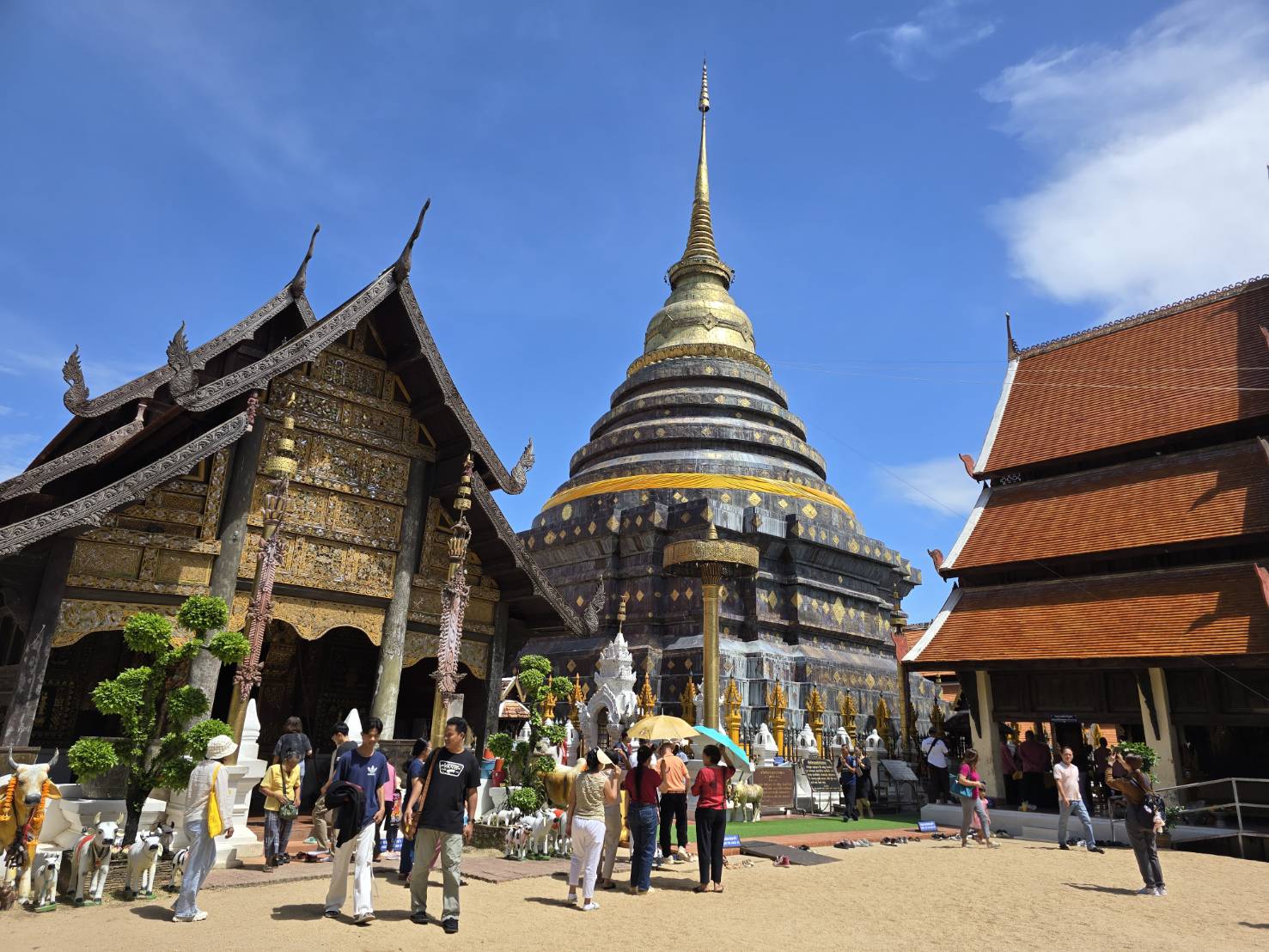 พอพ้นจากซุ้มประตูมาไม่กี่ก้าวจะพบกับ วิหารหลวง หลังใหญ่ที่ตั้งอยู่กลางลานวัด ด้วยศิลปะแบบล้านนาที่เรียบง่ายแต่ทรงพลัง วิหารนี้ได้รับการบูรณะขึ้นใหม่หลังจากหลังเก่าเคยถูกพายุพัดพังลงไปเมื่อปี พ.ศ. 2466 ด้านหลังวิหารคือ องค์พระธาตุหริภุญชัย เจดีย์ทรงระฆังอันสง่างามแบบล้านนา ที่หุ้มด้วยแผ่นทองจังโกสีทองสุกปลั่ง ทอดสายตาขึ้นไปแล้วอดไม่ได้ที่จะรู้สึกถึงความยิ่งใหญ่ องค์พระธาตุนี้ไม่เพียงเป็นหัวใจของเมืองลำพูน แต่ยังเป็นต้นแบบให้กับพระธาตุองค์สำคัญอื่นๆ ของล้านนา เช่น พระธาตุลำปางหลวง จังหวัดลำปาง และพระธาตุแช่แห้ง จังหวัดน่าน