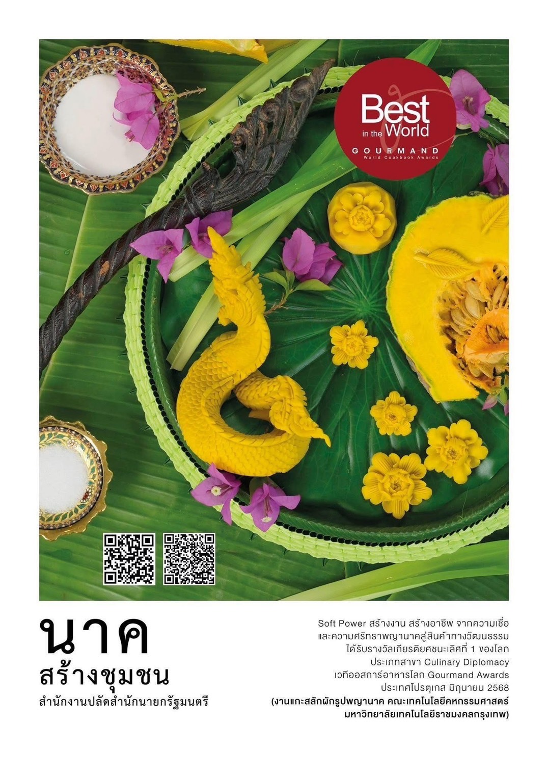 การประกวดเวทีออสการ์อาหารโลก (Gourmand Awards) ปี 2567 ณ กรุงลิสบอน สาธารณรัฐโปรตุเกส หนังสือ “นาคสร้างชุมชน” เอาชนะใจคณะกรรมการระดับโลกคว้ารางวัลชนะเลิศอันดับหนึ่งของโลกในประเภท Culinary Diplomacy (การทูตด้านอาหาร) หนังสือเล่มนี้ดำเนินการจัดทำโดยสำนักงานปลัดสำนักนายกรัฐมนตรี มีเป้าหมายเพื่อใช้เป็นแหล่งรวบรวมข้อมูลเกี่ยวกับนาคในสังคมไทย สู่การต่อยอดเป็น Soft Power สร้างการรับรู้ให้แก่คนทุกกลุ่มเรื่องนาคในวัฒนธรรมไทย รวมถึงเป็นจุดขายให้กับประเทศและสร้างโอกาสในการขับเคลื่อนเศรษฐกิจไทย