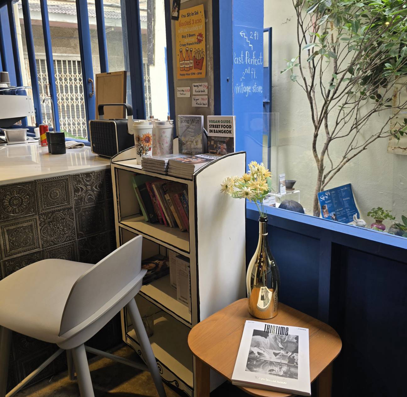 แต่ความจริงตัวร้านคือ อาคารสูงขนาด 2 ชั้น แม้ตัวร้านจะไม่ได้ตั้งอยู่ริมถนนใหญ่ แต่ด้วยการตกแต่งที่ชวนให้แวะเข้าไปดูใกล้ ๆ โดดเด่นด้วยโทนสีน้ำเงินเข้ม ด้านในตกแต่งสไตล์ยุโรปคลาสสิก ผสมผสานกับดอกไม้หลากสีที่ประดับอยู่ทั่วร้าน เติมบรรยากาศให้ดูสดชื่นและมีชีวิตชีวา ทำให้หลายคนอดใจไม่ไหวต้องแวะเข้ามาสัมผัสด้วยตัวเอง เมนูที่ห้ามพลาดของที่นี่คือ Coffee de Songwat กาแฟซิกเนเจอร์ที่สร้างสรรค์ขึ้นจากสูตรเฉพาะของทางร้าน ใช้เครื่องเทศที่ขายในทรงวาดอย่างขิง อบเชย และโป๊ยกั๊ก เบลนกับความร้อนจะได้รสชาติที่เผ็ดร้อน เปรี้ยวซ่า แต่ยังคงความกลมกล่อมไว้อย่างลงตัว อีกหนึ่งเมนูที่แนะนำคือ Old Town กาแฟที่มาพร้อมความนุ่มนวลของคาราเมล และกลิ่นหอมอบอวลของอบเชย ให้รสชาติละมุนทานง่าย