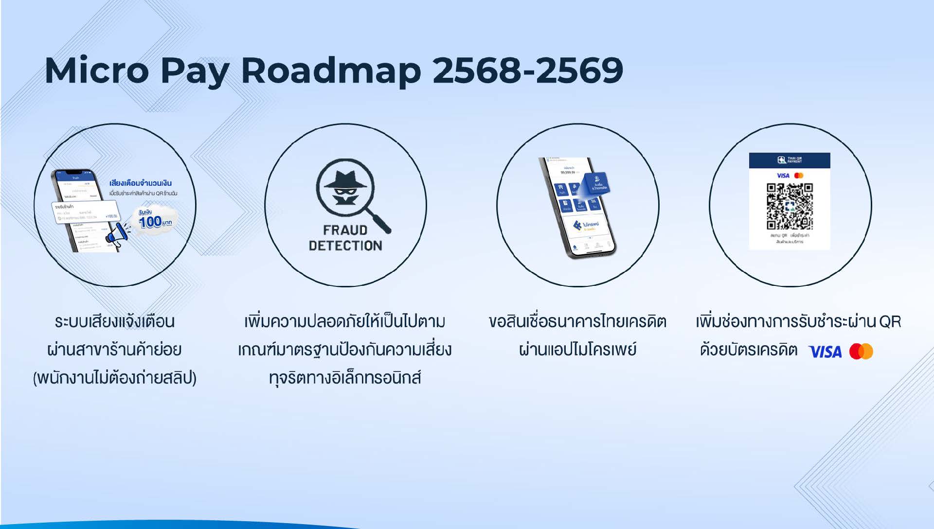 กมลภู กล่าวต่อว่า ในปี 2569 จะมีการเปิดให้บริการฟังก์ชั่นในไมโครเพย์ ได้แก่ 1. ระบบแจ้งเตือน สำหรับร้านค้าที่มีหลายสาขา เจ้าของร้านสามารถดูยอดธุรกรรมของทุกสาขาได้แบบเรียลไทม์ 2. ระบบความปลอดภัย ที่สอดคล้องกับแนวทางของธนาคารแห่งประเทศไทย 3. การใช้ข้อมูล Transaction เพื่อสนับสนุนสินเชื่อกับทางธนาคารไทยเครดิต โดยสามารถยื่นขอสินเชื่อผ่านแอปได้ 4. รองรับการรับชำระผ่านบัตรเครดิต โดยร่วมกับ Visa, Mastercard และ e-Wallet อื่นๆ เพื่อรองรับนักท่องเที่ยวและลูกค้าทั่วไป
