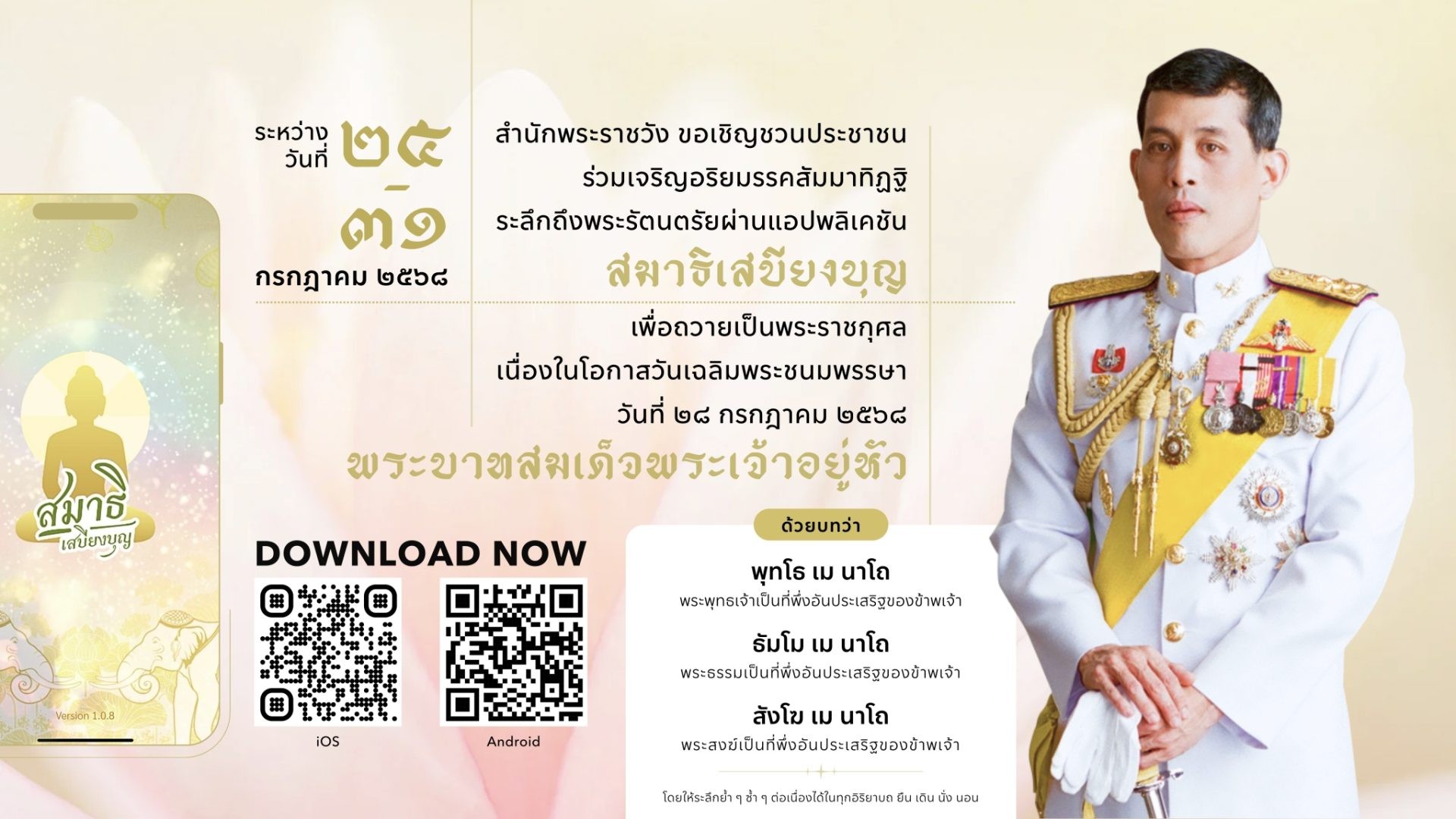โอกาสมหามงคลนี้ สำนักพระราชวัง ขอเชิญชวนประชาชนร่วมเจริญอริยมรรค “สัมมาทิฏฐิ” ระลึกถึงพระรัตนตรัย ว่าเป็นสรณะที่พึ่งที่ยึดถือ อันเป็นทางเป็นธรรมที่พระพุทธองค์ได้ตรัสไว้โดยชอบ เพื่อถวายเป็นพระราชกุศลแด่พระบาทสมเด็จพระเจ้าอยู่หัว เนื่องในโอกาสวันเฉลิมพระชนมพรรษา วันที่ 28 กรกฎาคม 2568 ผ่านแอปพลิเคชัน “สมาธิเสบียงบุญ” ระหว่างวันที่ 25 – 31 กรกฎาคม 2568 ทั้งนี้ สามารถดาวน์โหลดแอปพลิเคชันได้ทั้ง PLAY STORE และ APP STORE