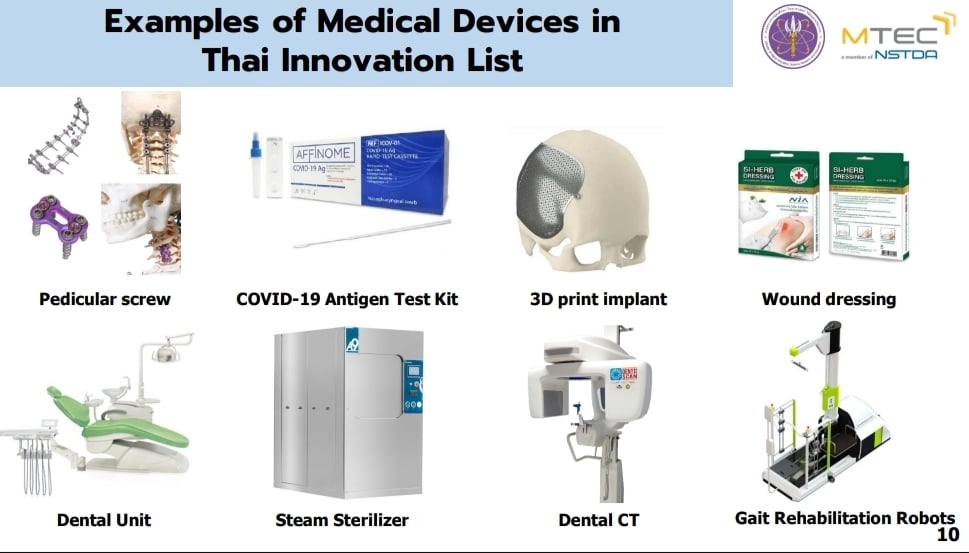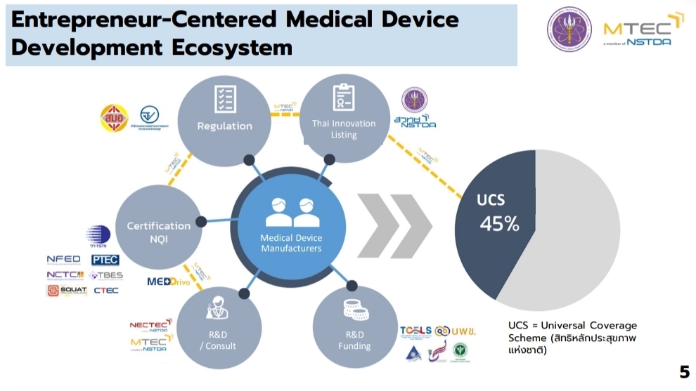 ด้านดร.พสุ สิริสาลี นักวิจัยอาวุโสทีมวิจัยนวัตกรรมผลิตภัณฑ์ทางการแพทย์ ศูนย์เทคโนโลยีโลหะและวัสดุแห่งชาติ (MTEC) สวทช. กล่าวว่า ปัจจุบันประเทศไทยยังต้องพึ่งพาการนำเข้าอุปกรณ์ทางการแพทย์และเทคโนโลยีจากต่างประเทศเป็นมูลค่าสูงถึง 60,000 ล้านบาทต่อปี สะท้อนให้เห็นถึงปัญหาเชิงโครงสร้างในอดีต โดยเฉพาะการลงทุนด้านวิจัยและพัฒนา (R&D) ที่ยังอยู่ในระดับต่ำ แม้จะมีทั้งบุคลากรและไอเดียที่พร้อม ดังนั้น จึงมุ่งส่งเสริมการวิจัยและพัฒนาเชิงลึก (Upstream R&D) เพื่อวางรากฐานที่มั่นคงให้กับภาคอุตสาหกรรม โดยเฉพาะกลุ่มการแพทย์และสุขภาพ ซึ่งเป็นอุตสาหกรรมเป้าหมายสำคัญของประเทศ