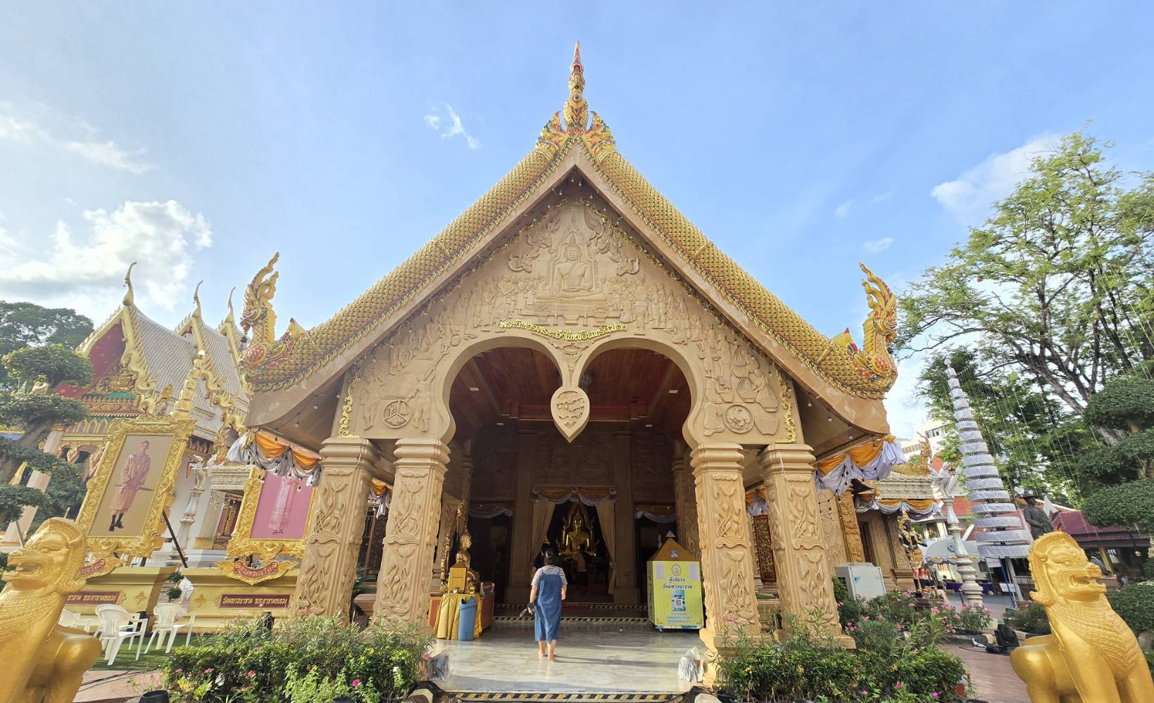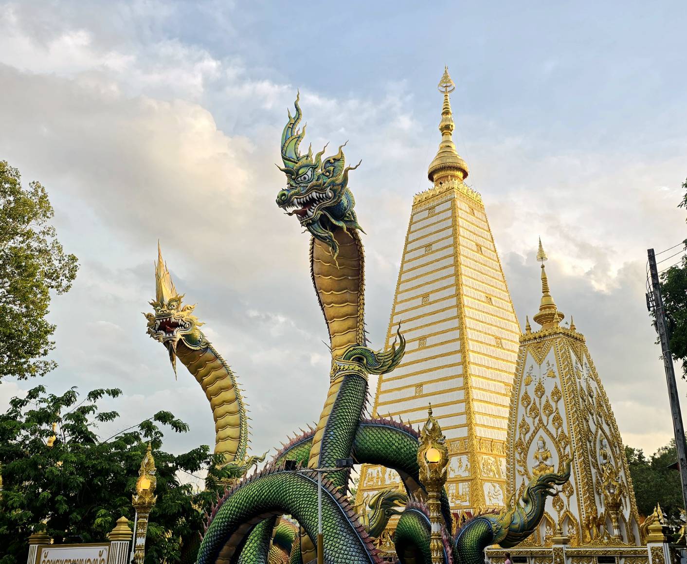 มาถึงอีกวัดที่ วัดพระธาตุหนองบัว เป็นหนึ่งในวัดที่สะท้อนถึงความงามและประวัติศาสตร์แห่งศรัทธา วัดแห่งนี้มีความโดดเด่นในด้านสถาปัตยกรรม โดยเฉพาะพระธาตุเจดีย์ศรีมหาโพธิ์ ซึ่งสร้างขึ้นเพื่อเป็นสัญลักษณ์ในโอกาสครบรอบ 25 ศตวรรษของพระพุทธศาสนาในปี พ.ศ. 2500 เจดีย์นี้จำลองแบบมาจากเจดีย์ที่พุทธคยา ประเทศอินเดีย บรรจุพระบรมสารีริกธาตุ บริเวณฐานเจดีย์มีขนาดกว้างด้านละ 5 เมตร สูงประมาณ 17 เมตร ขณะที่องค์พระธาตุที่ครอบองค์พระธาตุหลักมีขนาดกว้าง 17 เมตร สูงถึง 56 เมตร ลวดลายสีทองบนองค์พระธาตุสร้างความสง่างามและศักดิ์สิทธิ์