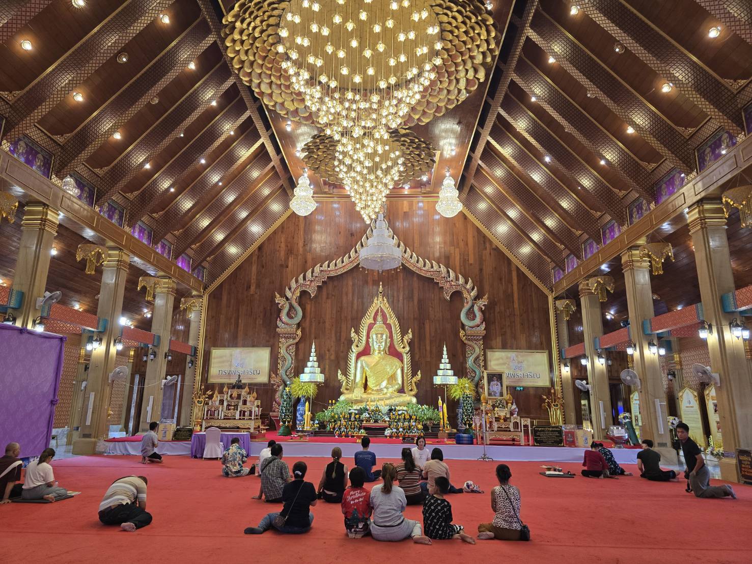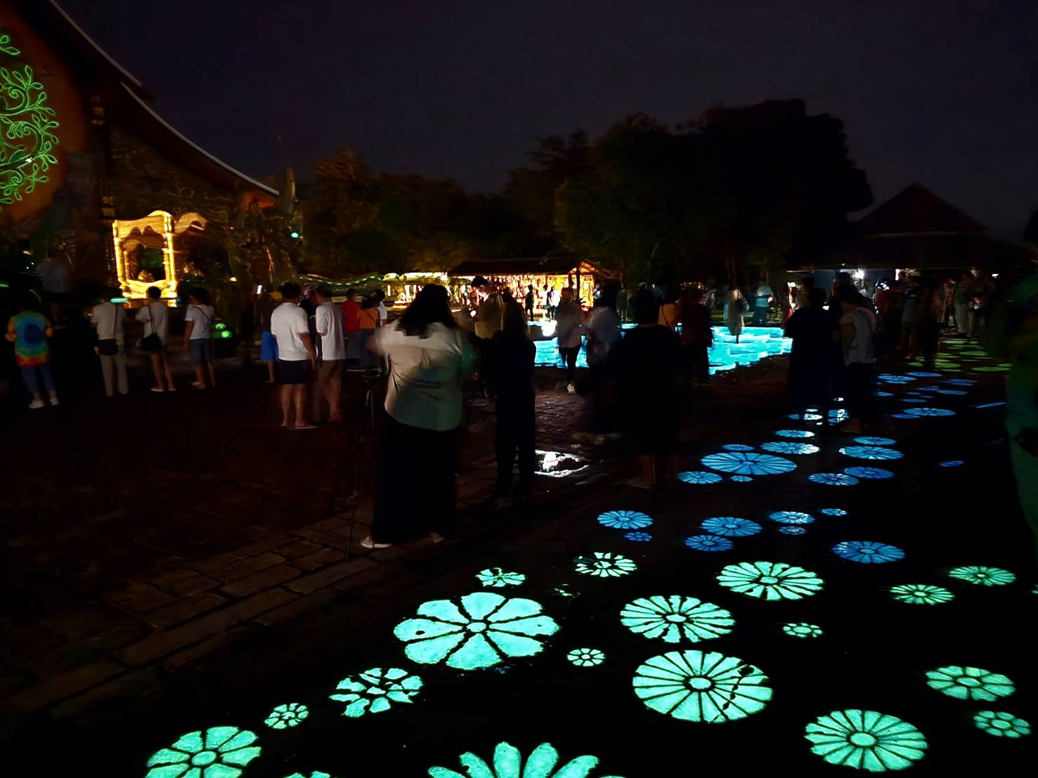 เมื่อแสงอาทิตย์ลับฟ้า ต้นกัลปพฤกษ์บนผนัง และบนพื้นถูกแต่งแต้มคล้ายกับรากไม้อันงดงาม ประดับด้วยดอกไม้ จะค่อย ๆ เรืองแสง เป็นสีเขียวมรกตอ่อน ๆ บรรยากาศยามค่ำที่พระอุโบสถล้อมรอบด้วยความมืดช่างงดงาม ไม่แพ้ผู้คนที่หลั่งไหลมาชมหนาแน่นเลยทีเดียว ช่วงเวลาที่ดีที่สุดในการเยี่ยมชมคือ ตอนเช้ามืดประมาณ 06.00 น. และ ช่วงหัวค่ำหลัง 19.30 น. ซึ่งแสงเรืองรองจากต้นไม้ศักดิ์สิทธิ์จะเริ่มเปล่งประกายให้ชมอย่างอิ่มเอมใจ