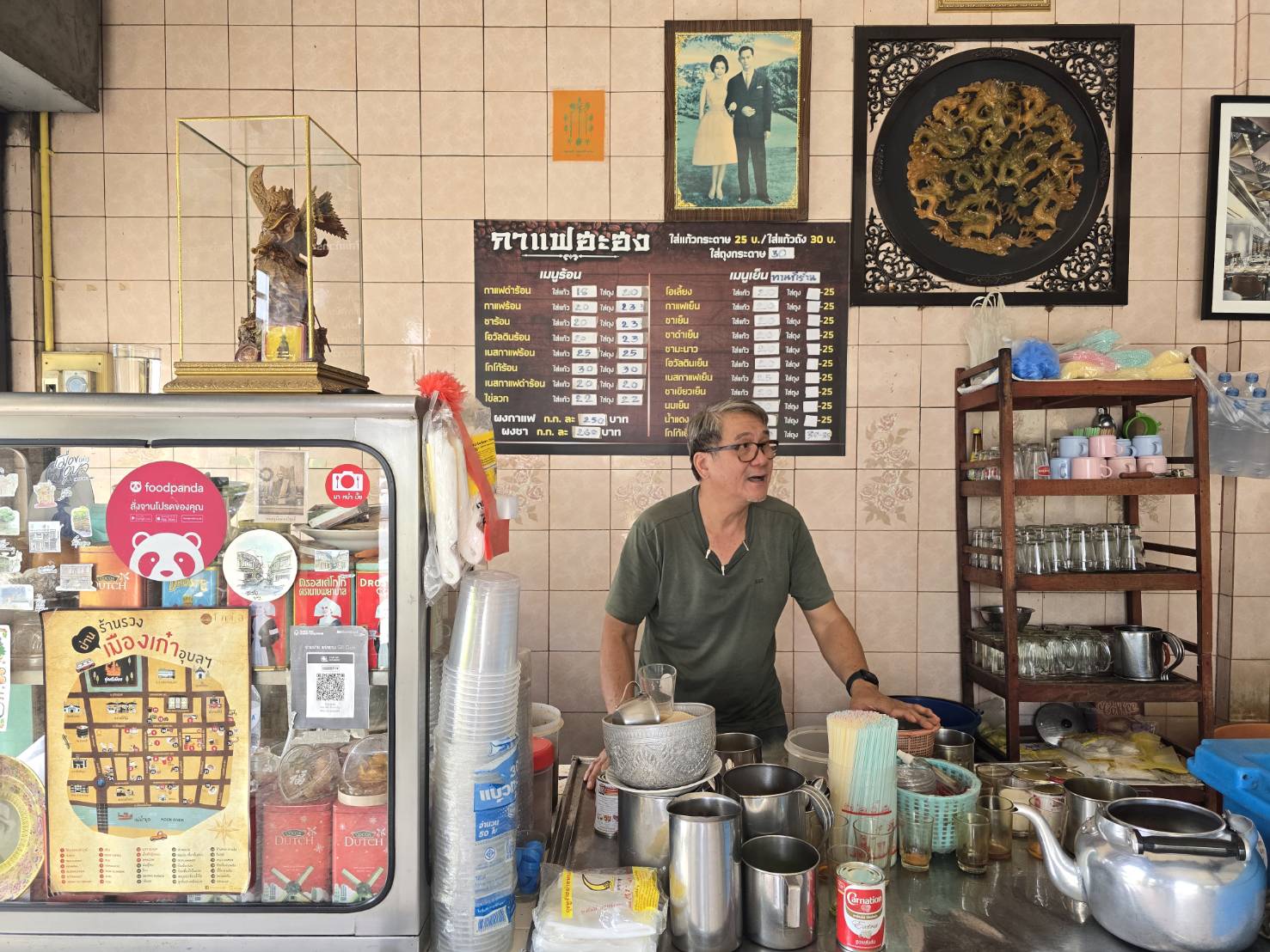 แวะพักจิบกาแฟกันที่ร้าน “กาแฟฮะฮง” ร้านกาแฟโบราณในตำนานที่อยู่คู่ย่านเมืองเก่าอุบลฯ มาตั้งแต่ปี 2511 เดิมทีเคยตั้งอยู่หน้าวัดหลวง ก่อนจะย้ายมาเปิดร้านในทำเลปัจจุบัน ตัวร้านตกแต่งแบบเรียบง่ายแต่คลาสสิก ให้บรรยากาศอบอุ่นเหมือนสภากาแฟ ของคนท้องถิ่น ที่ใครแวะมาก็จะได้กลิ่นกาแฟหอมๆ อบอวล พร้อมไข่ลวกสักฟอง แล้วนั่งพูดคุย ชมบรรยากาศยามเช้าช้าๆ แบบไม่เร่งรีบ บางครั้งแค่ได้กาแฟถ้วยโปรดสักแก้ว ก็เหมือนได้หยุดเวลาไว้ชั่วครู่