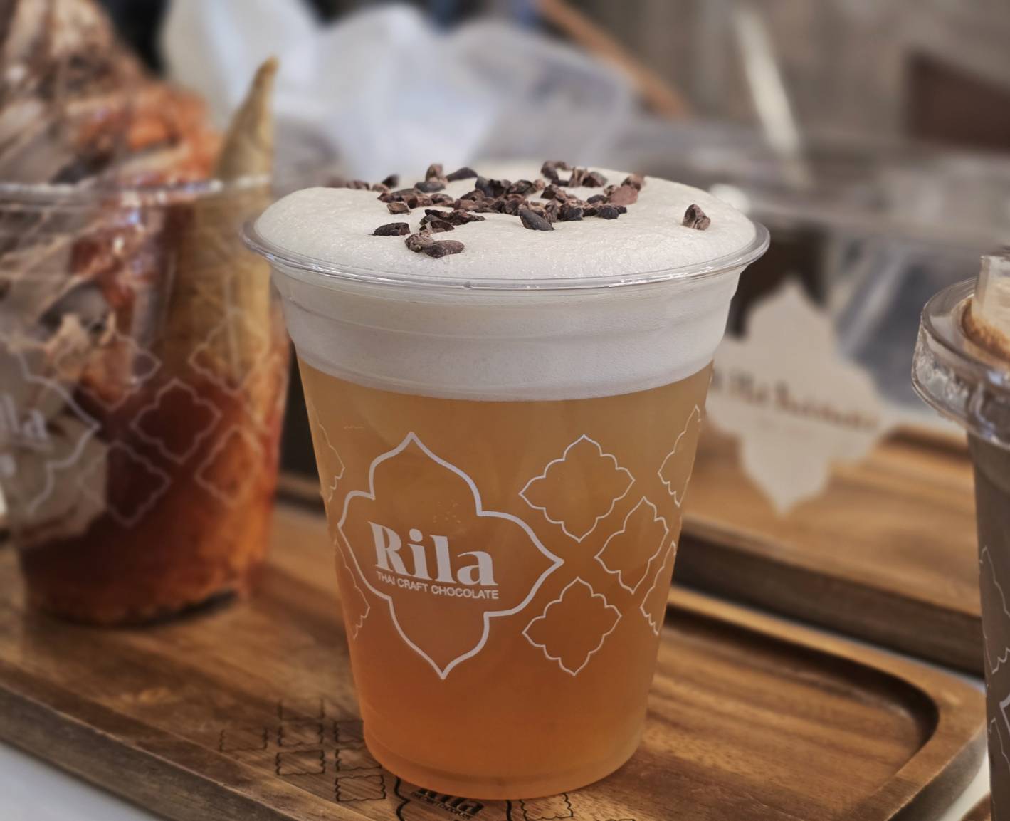 เดินจากร้านกาแฟฮะฮง ลัดเลาะริมทางเดินมาจะเจอกับร้าน “Rila Thai Craft Chocolate” ถ้าใครเป็นสายช็อกโกแลต ต้องไม่พลาดร้านนี้ เพราะช็อกโกแลตทั้งหมดผลิตในโรงงานของทางร้านเอง โดยใช้เมล็ดโกโก้จากสวนประจำในแต่ละจังหวัด เช่น ของอุบลฯ จะมาจากแถบน้ำยืน ที่ขึ้นชื่อเรื่องคุณภาพของเมล็ดโกโก้ เป็นต้น