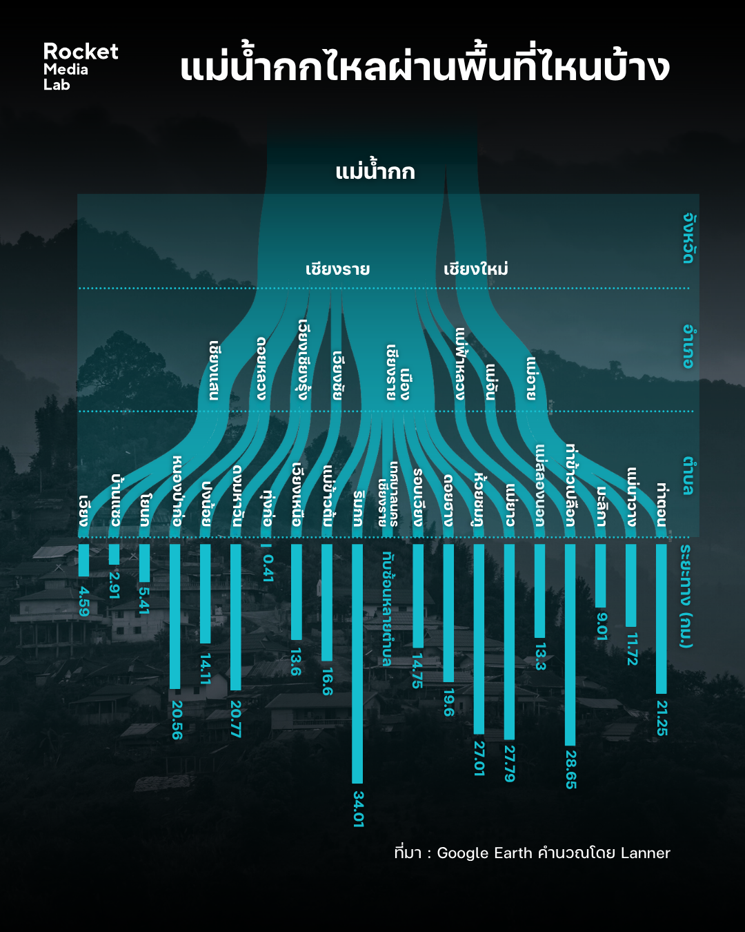เมื่อพิจารณาเฉพาะพื้นที่ริมแม่น้ำกกทั้งในจังหวัดเชียงรายและเชียงใหม่ จะพบว่าพื้นที่ที่แม่น้ำกกไหลผ่านในจ.เชียงใหม่ มี 1 อำเภอ คือแม่อาย ในพื้นที่ 3 ตำบล คือ ท่าตอน แม่นาวาง และมะลิกา ส่วนใน จ.เชียงราย มี 7 อำเภอ ในพื้นที่ 16 ตำบล คือ อ.แม่จัน มีต.ท่าข้าวเปลือก อ.แม่ฟ้าหลวง มีต.แม่สลองนอก อ.เมืองเชียงราย มีต.แม่ยาว ห้วยชมภู ดอยฮาง รอบเวียง ริมกก แม่ข้าวต้ม และเทศบาลนครเชียงรายที่ทับซ้อนหลายตำบล อำเภอเวียงชัย มีต.เวียงเหนือ อ.เวียงเชียงรุ้ง มีต.ทุ่งก่อ ดงมหาวัน อ.ดอยหลวง มีต.ปงน้อย หนองป่าก่อ อ.เชียงแสน มีต.โยนก บ้านแซว เวียง รวมระยะทางไม่น้อยกว่า 306 กิโลเมตร และมีประชากรในพื้นที่ 19 ตำบล ทั้งที่มีสัญชาติไทยและไม่ได้มีสัญชาติไทยไม่ต่ำกว่า 182,931 ราย (ยังไม่รวมประชากรในเทศบาลนครเชียงรายที่แม่น้ำกกไหลผ่านทับซ้อนหลายตำบล) จะกลายเป็นผู้ได้รับผลกระทบเหล่านี้ (ข้อมูลจากสำนักบริหารการทะเบียน กรมการปกครอง ณ มิ.ย. 2568)