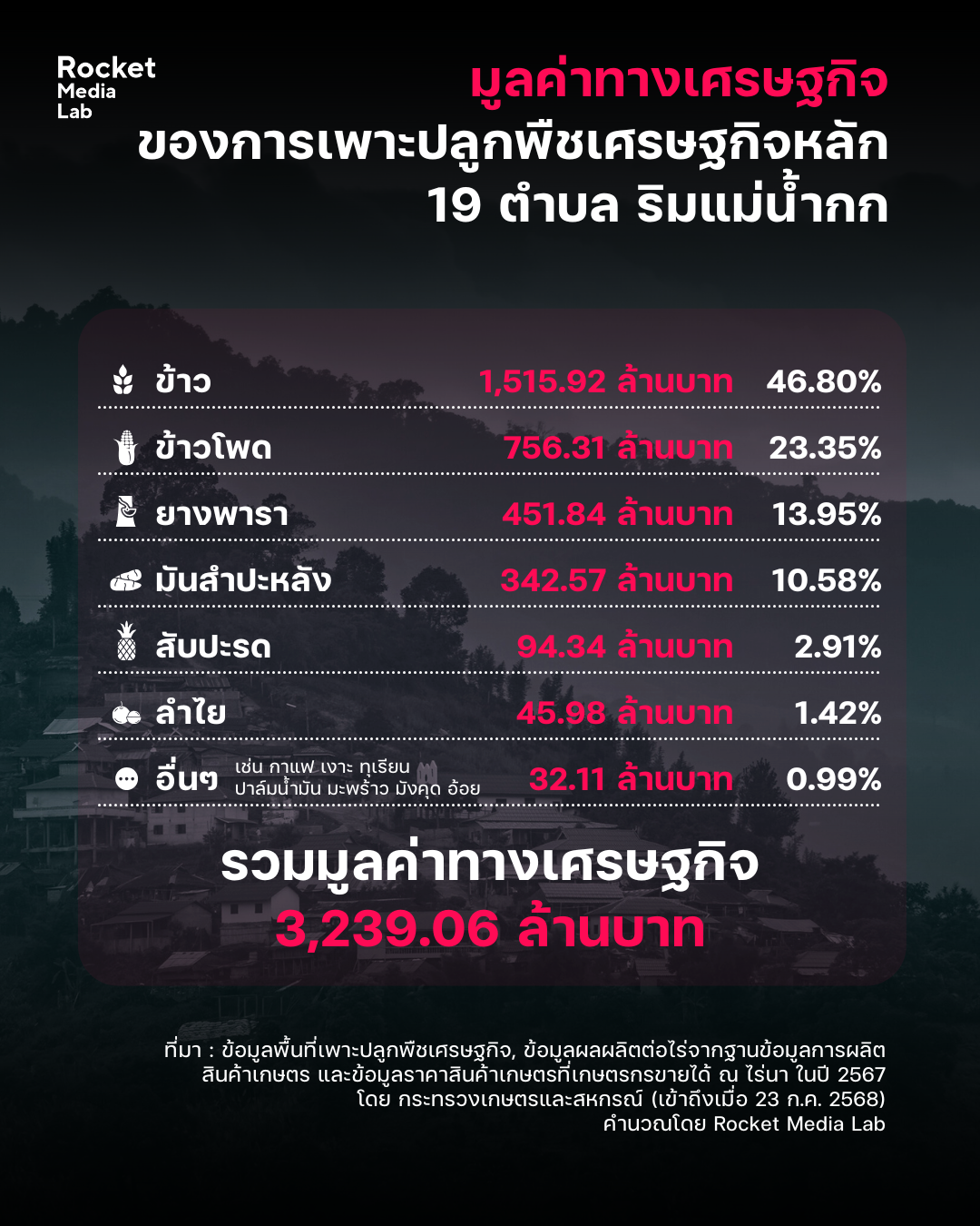 หากจะประเมินมูลค่าความเสียหายทางเศรษฐกิจที่อาจเกิดขึ้น จากการที่แม่น้ำกกปนเปื้อนสารหนูและโลหะหนักเกินค่ามาตรฐานจนส่งผลเสียหายต่อพืชผลการเกษตรทั้งหมดที่เพาะปลูกริมแม่น้ำกก Rocket Media Lab นำเอาข้อมูลพื้นที่เพาะปลูกพืชเศรษฐกิจในแต่ละชนิดริมแม่น้ำกกทั้ง 19 ตำบล และข้อมูลผลผลิตต่อไร่จากฐานข้อมูลการผลิตสินค้าเกษตร โดยกระทรวงเกษตรและสหกรณ์มาใช้เป็นฐานในการคำนวณจำนวนผลิตที่เกิดขึ้นและข้อมูลราคาสินค้าเกษตรที่เกษตรกรขายได้ ณ ไร่นา ในปี 2567 ของกระทรวงเกษตรฯ มาใช้คำนวณ พบว่า จากผลผลิตของพืชเศรษฐกิจริมแม่น้ำกก 14 ชนิด มีพื้นที่การเพาะปลูก 340,358 ไร่ ใน 19 ตำบล ทั้งในเชียงใหม่และเชียงรายที่แม่น้ำกกไหลผ่าน อาจมีมูลค่าทางเศรษฐกิจปีละประมาณ 3,239,061,808.4 บาท หรือ13% ของผลิตภัณฑ์มวลรวมเฉพาะภาคการเกษตร จ.เชียงราย