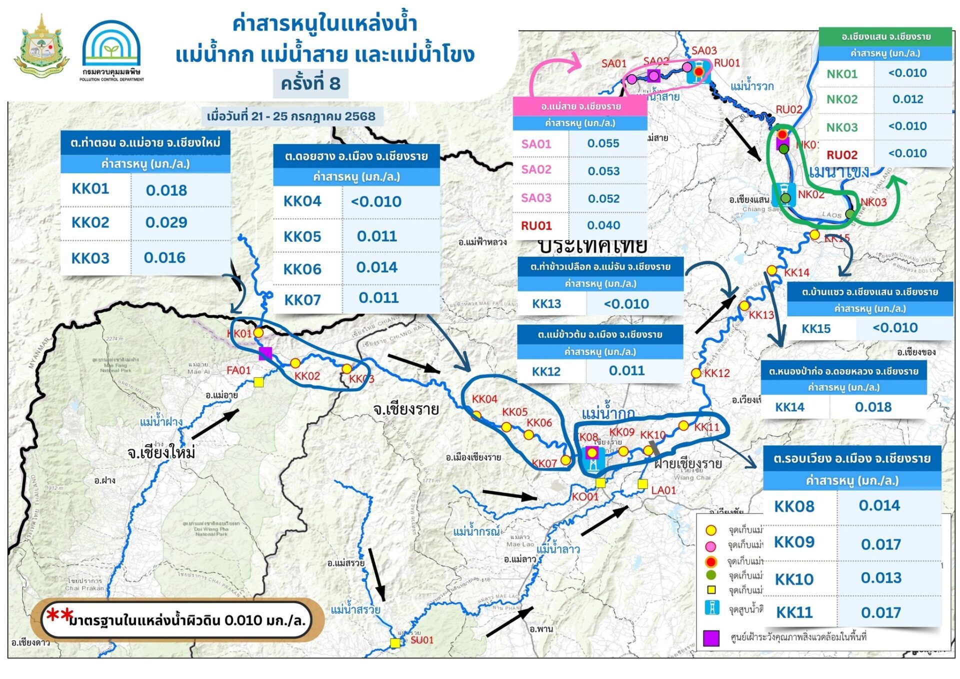 “แม่น้ำกก” พบว่า สารหนูมีค่าสูงเกินค่ามาตรฐานฯ ทุกจุดตรวจวัด ตั้งแต่บริเวณชายแดนไทย – พม่า อ.แม่อาย จ.เชียงใหม่ จนถึงบริเวณ ต.บ้านแซว อ.เชียงแสน จ.เชียงราย (KK01 -KK015) โดยมีค่าอยู่ในช่วง น้อยกว่า 0.010 – 0.016 มิลลิกรัมต่อลิตร (มก./ล.) (มาตรฐานไม่เกิน 0.010 มก./ล.) ดังนี้