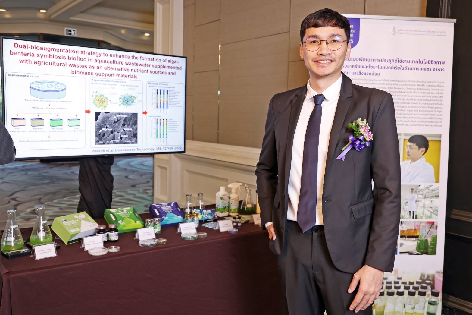 ด้านนักวิทยาศาสตร์ดีเด่นเทคโนโลยีชีวภาพ ประจำปี2568 อีกราย ดร. ศิรสิทธิ์ ศรีนวลปาน ผู้เชี่ยวชาญด้านเทคโนโลยีชีวภาพ กล่าวว่า การประยุกต์ใช้สาหร่ายและไซยาโนแบคทีเรียสร้างมูลค่าเพิ่มใน 4 สาขาหลัก ได้แก่ การเกษตร อาหาร พลังงาน และสิ่งแวดล้อม โดยมีเป้าหมายสนับสนุนแนวคิด BCG Economy และการพัฒนาที่ยั่งยืน (SDGs) เพื่อสร้างสมดุลระหว่างเศรษฐกิจ สังคม และสิ่งแวดล้อม ซึ่งการเพาะเลี้ยงสาหร่ายขนาดเล็กและไซยาโนแบคทีเรียร่วมกับระบบปลูกพืชไร้ดิน เพื่อเพิ่มประสิทธิภาพการผลิตและลดการใช้ปุ๋ยเคมี รวมถึงศึกษาการใช้แอคติโนแบคทีเรียร่วมกับชีวภัณฑ์จากสาหร่ายเสริมสร้างความแข็งแรงของพืชภายใต้สภาวะเครียด นำไปสู่ผลผลิตและคุณภาพพืชที่ยั่งยืน