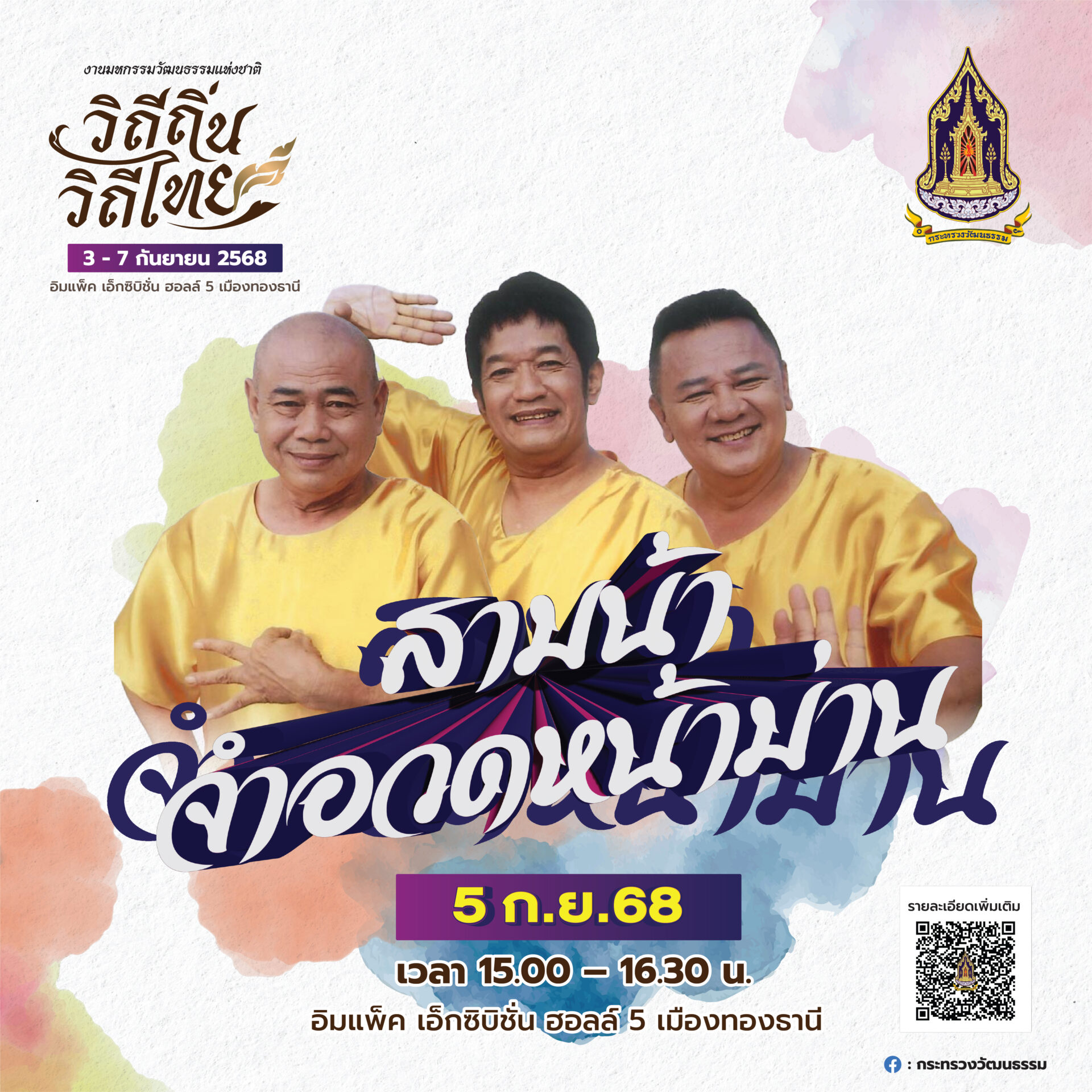 วันที่ 5 กันยายน 2568 มีความน่าสนใจมากมาย อาทิ ดนตรีโฟล์คซอง จากเมืองลำเนียงเจียงฮาย ศิลปวัฒนธรรมจากกรมส่งเสริมวัฒนธรรม ฮาท้องแข็งกับนายพิเชษฐ์ เอี่ยมชาวนา (โย่ง เชิญยิ้ม) ศิลปินแห่งชาติ สาขาศิลปะการแสดง (เพลงฉ่อย) ปี 2566 หรือจำอวดหน้าม่าน การแสดงวงดนตรี วงเมนทอล การแสดงโนราร่วมสมัยของ ผศ.ดร.ธรรมนิตย์ นิคมรัตน์ ศิลปินแห่งชาติ สาขาศิลปะการแสดง (โนรา) ปี 2564 นอกจากนี้ ยังมีคอนเสิร์ตและการแสดงพิเศษของ D GERRARD ดูรายละเอียดเพิ่มเติมได้ที่ Facebook กระทรวงวัฒนธรรม หรือสายด่วนวัฒนธรรม 1765