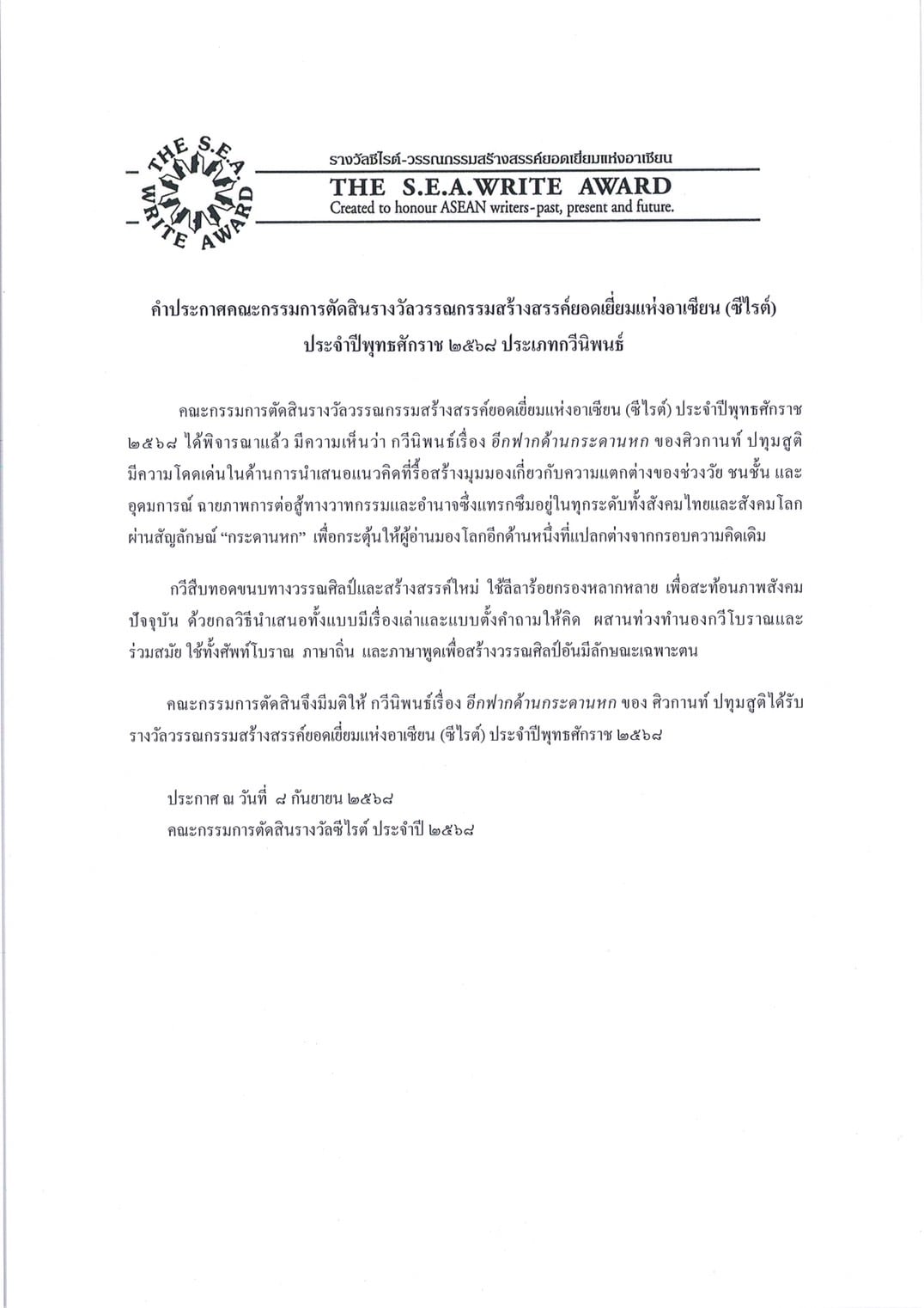 8 ก.ย. 2568 คุณหญิงทิพาวดี เมฆสวรรค์ ประธานคณะกรรมการดำเนินงานรางวัลวรรณกรรมสร้างสรรค์ยอดเยี่ยมแห่งอาเซียน (ซีไรต์) คณะกรรมการดำเนินงานรางวัลวรรณกรรมซีไรต์ คณะกรรมการตัดสิน พร้อมด้วยผู้สนับสนุน กำหนดจัดงานแถลงข่าวการประกาศผลรางวัลวรรณกรรมสร้างสรรค์ยอดเยี่ยมแห่งอาเซียน (ซีไรต์) ประจำปี 2568 ประเภทกวีนิพนธ์ รอบตัดสิน ใน ณ ห้อง Auditorium ชั้น 10, C asean Ratchada อาคาร CW Tower พร้อมเผยแพร่คำประกาศคณะกรรมการตัดสินรางวัลวรรณกรรมสร้างสรรค์ยอดเยี่ยมแห่งอาเซียน (ซีไรต์ ) ประจำปี พุทธศักราช 2568 ประเภทกวีนิพนธ์