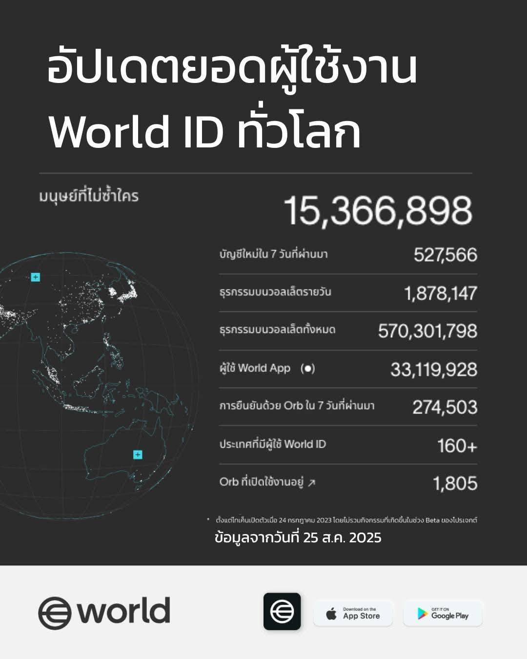 ปัจจุบันทั่วโลกมีผู้สร้างบัญชีแล้วกว่า 33 ล้านคน โดยผ่านการยืนยันความเป็นมนุษย์แล้วราว 15–16 ล้านคน ในประเทศไทย มีผู้สร้างบัญชีแล้วกว่า 2 ล้านคน ในจำนวนนี้ประมาณ 1 ล้านคน ได้ทำการยืนยันแล้ว นอกจากนี้ผู้ใช้งานสามารถลบข้อมูลได้ทุกเมื่อผ่านเมนู Settings ข้อมูลทั้งหมด รวมถึง World ID จะถูกลบออกไปทันที World มีเจตนารมณ์ชัดเจนในการนำเทคโนโลยีนี้มาเป็น รากฐานของการอยู่ร่วมกับ AI อย่างปลอดภัย เพราะในอีกไม่กี่ปีข้างหน้า สังคมอาจเผชิญสถานการณ์ที่ AI และบอทมีสัดส่วนสูงถึง 90% ของผู้ใช้งานอินเทอร์เน็ต การยืนยันความเป็นมนุษย์โดยไม่เปิดเผยข้อมูลส่วนบุคคลจึงเป็นหัวใจสำคัญของโลกอนาคต