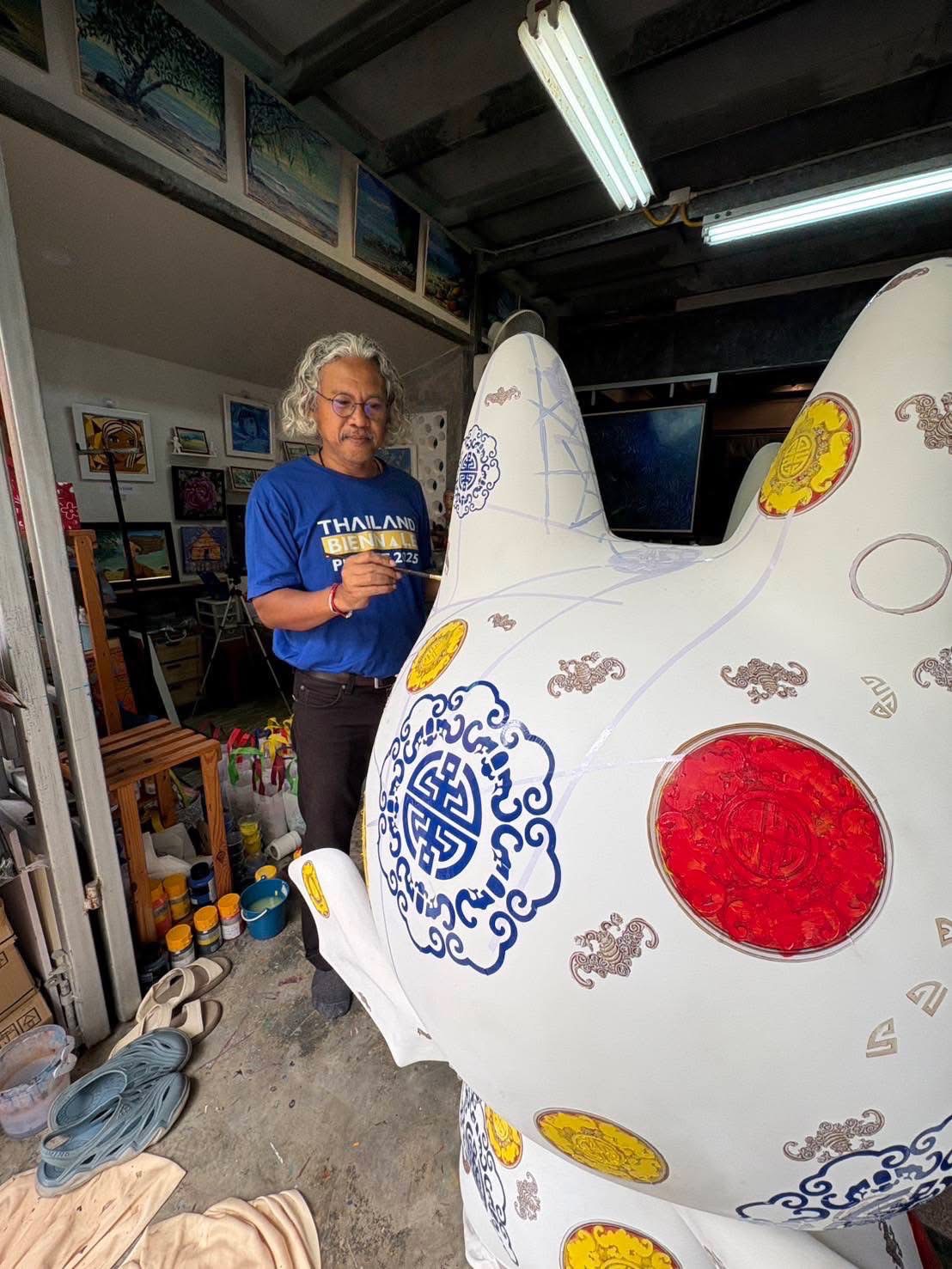 สัมฤทธิ์ เพชรคง ที่ปรึกษาสมาคมศิลป์ภูเก็จ กล่าวว่า มาสคอตของงานมหกรรมศิลปะร่วมสมัยนานาชาติ Thailand Biennale, Phuket 2025 มีที่มาจากอัตลักษณ์ทางสถาปัตยกรรมชิโนโปรตุกีสของภูเก็ต เราจะพบเห็นค้างคาวมงคล 5 ประการนี้ได้ทั่วไป โดยมีนัยสำคัญสื่อความหมายถึงความมั่งคั่งร่ำรวย สุขภาพดีปราศจากโรคภัย อายุยืนยาว มีคุณธรรมอันประเสริฐ และความสุขนิรันดร์ สำหรับชาวภูเก็ตแล้วเป็นสิ่งที่รู้จักกันมาก เป็นสัญลักษณ์ของความมงคล ก้าวหน้า