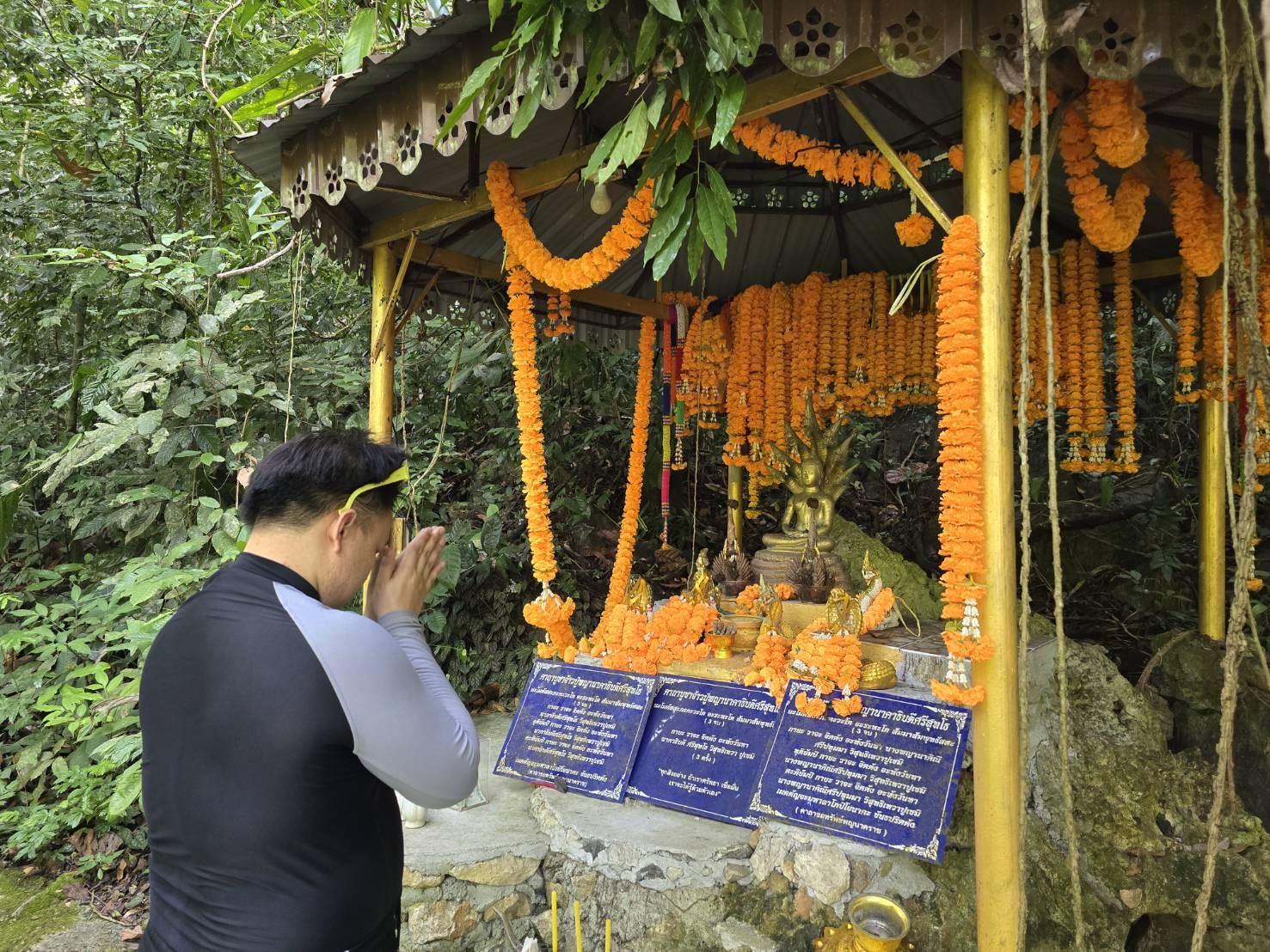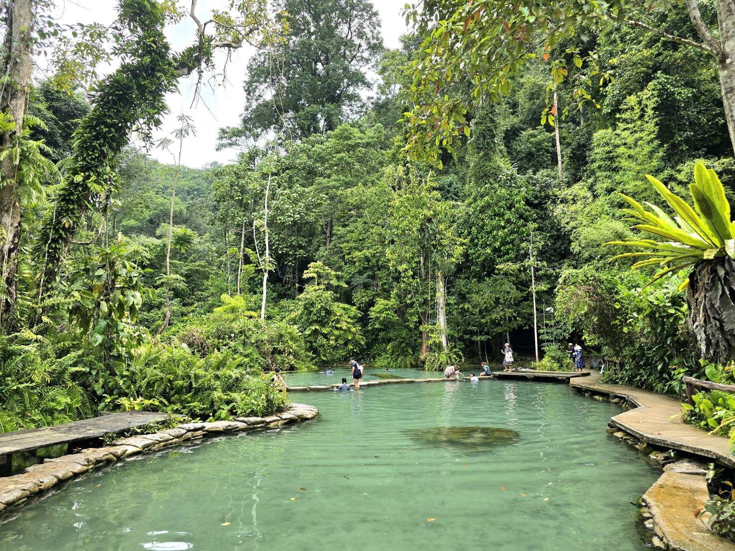 ที่นี่ทุกอย่างถูกแบ่งโซนไว้อย่างชัดเจน ทั้งจุดเล่นน้ำที่ปลอดภัย และบ่อน้ำศักดิ์สิทธิ์ที่ห้ามลงเล่น เพื่อปกป้องต้นน้ำให้คงความบริสุทธิ์ เมื่อเราเดินมาถึงบ่อน้ำตรงหน้า น้ำใสสีฟ้าอมเขียวดั่งมรกตจนมองทะลุถึงพื้นทรายและตะกอนหินปูนด้านล่าง และที่พิเศษกว่านั้นคือฝูงปลาอีกองแหวกว่ายไปมา ลำตัวป้อมสั้น สีขาวอมเหลืองหรืออมชมพู มีแถบดำคาดเด่นชัด ถือเป็นสัญญาณบอกว่าน้ำในลำธารแห่งนี้สะอาดและมีคุณภาพดีจริง ๆ ในโซนที่เล่นน้ำได้ทุกคนจึงสนุกขึ้น เพราะได้เล่นไปพร้อมกับฝูงปลาอย่างเป็นธรรมชาติ เดินขึ้นไปอีกหน่อยจะพบพื้นที่ห้ามเล่นน้ำ เนื่องจากเป็นจุดกำเนิดของสายตาน้ำผุด ชาวบ้านได้สร้างศาลจ้าวปู่พญานาคาธิบดีศรีสุทโธ ขึ้นเพื่อเป็นที่พึ่งทางใจตามความเชื่อและถ้าอยากพิสูจน์ความใสสะอาด ก็สามารถลองตักน้ำขึ้นมาชิมได้เลย เพราะเราได้ลองแล้วไม่มีสี ไม่มีกลิ่น ไม่มีรสชาติ แต่กลับสดชื่น