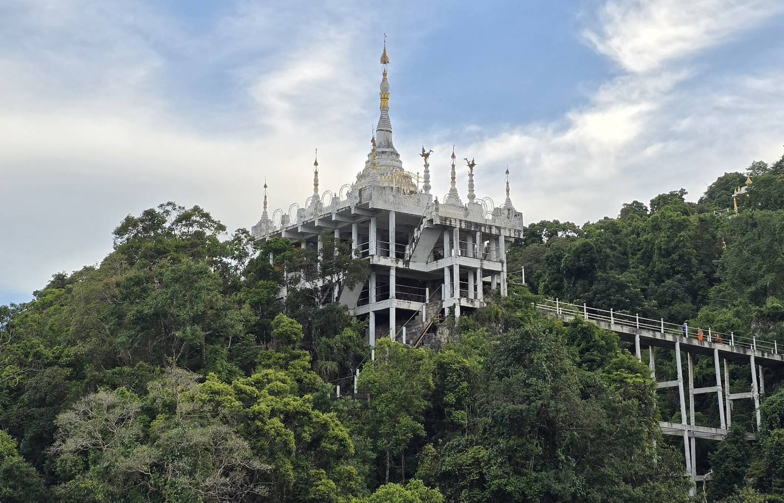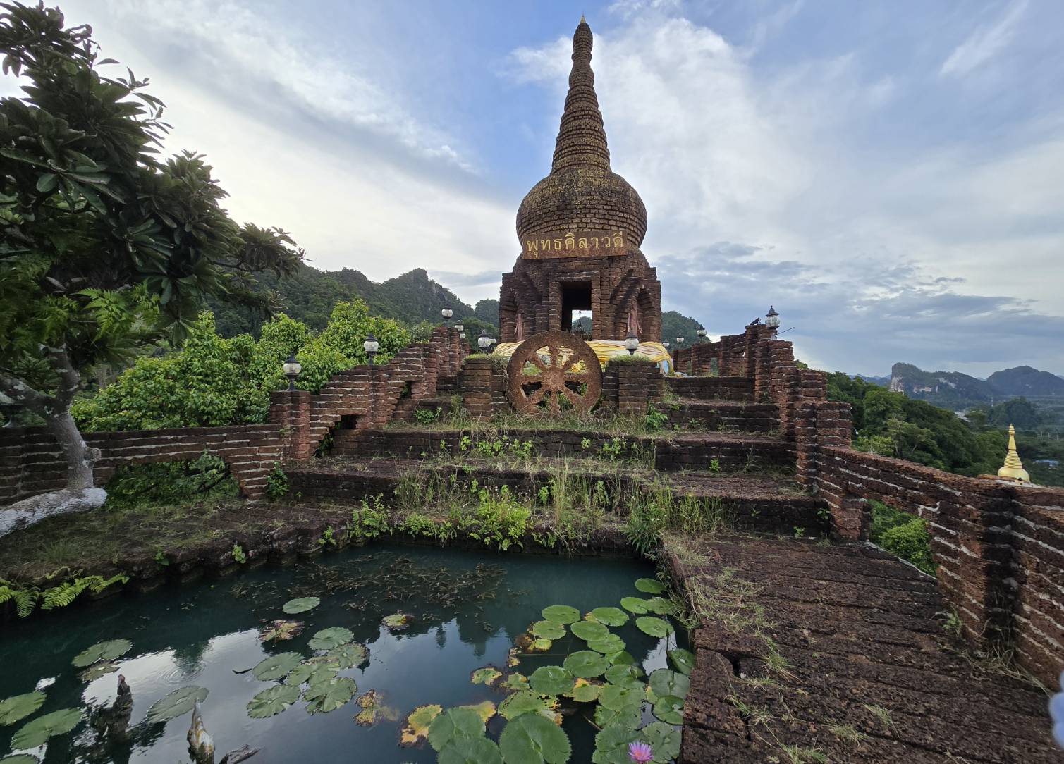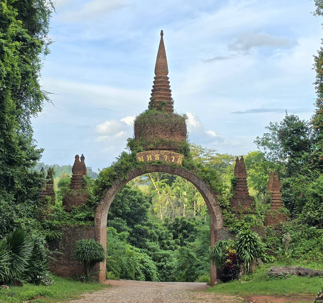 แวะพักเติมพลังกันที่ รุ่งฟ้าฟาร์มสเตย์ (เขาสก) ฟาร์มเล็ก ๆ ท่ามกลางหุบเขาเขียวขจี ทำให้รู้สึกสดชื่นเหมือนได้มาชาร์จแบตร่างกายทันที พอเจอกับ พี่ยู-นพดล จันทร์อยู่ เจ้าของฟาร์ม ซึ่งเป็นชายวัยกลางคนหน้าดุ ๆ แต่พอยิ้มและทักทายกลับทำให้เรารู้เลยว่าใจดีมาก ๆ เขาเล่าที่มาของฟาร์มให้ฟังว่าเดิมทำอาชีพไกด์มา 20 ปี ก่อนหน้านี้ที่บ้านก็ปลูกสวนเล็ก ๆ ประมาณ 3 ไร่ครึ่ง เพื่อน ๆ ที่มาเที่ยวบ้านแนะนำให้ทำเป็นแหล่งท่องเที่ยว อีกทั้งภรรยาก็อยากให้เขาอยู่กับครอบครัวมากขึ้น จึงเริ่มทำฟาร์มตั้งแต่ก่อนเกิดโควิด-19 เพียง 1 ปี ในสวนปลูกผักสวนครัวแบบปลอดสารเคมี 100% ทั้งผักเหลียง มะกรูด มะเขือเปราะ มะเขือยาวม่วง ผักบุ้ง บวบ และยังมีก่อไผ่ตง ที่ช่วงนี้กำลังได้หน่อพอดีเจดีย์องค์ที่ 2 พุทธศิลาวดี