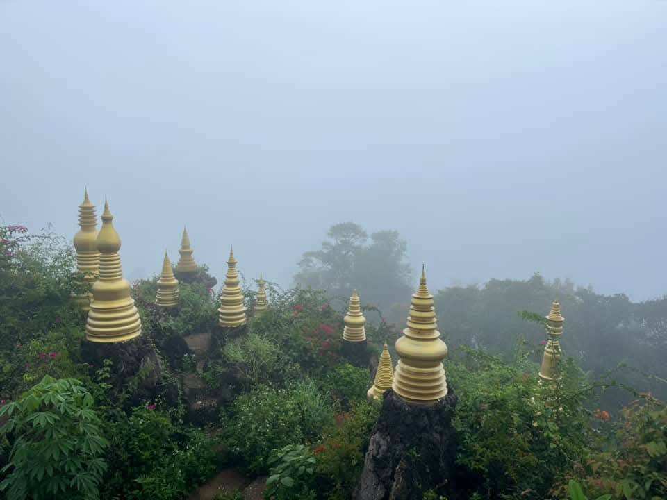 เส้นทางเดินจากเจดีย์องค์ที่ 2 ไม่ได้เชื่อมตรงกับ เจดีย์องค์ที่ 4 “พุทธนครกลางหาว” แต่จากเจดีย์องค์นี้สามารถเดินต่อไปยัง เจดีย์องค์ที่ 5 “มหาพุทธะสะหัสสะวดี” และ เจดีย์องค์ที่ 6 “พุทธธาราวดี” ใช้เวลาเดินประมาณ 30–40 นาที เส้นทางสลับระหว่างทางเดินธรรมชาติและบันไดปูน ถือว่าง่ายพอสมควร แต่ต้องระวังบางช่วงที่แคบและลื่น โดยเฉพาะในฤดูฝน เมื่อขึ้นมาถึง เจดีย์องค์ที่ 4 จะได้พบรอยพระพุทธบาทประดิษฐานในศาลาองค์พระประธานกลางเจดีย์ รอบด้านล้อมด้วยเจดีย์องค์เล็กสีทอง 32 องค์ และดอกไม้ป่าที่ขึ้นประดับสวยงาม ส่วน เจดีย์องค์ที่ 5 ตั้งเด่นด้วยสีขาวตัดกับหุบเขา ภายในประดิษฐานพระบรมสารีริกธาตุ รอบด้านมีศาลาระฆังตีเพื่อเสริมสิริมงคล และสามารถทอดสายตาเห็นยอดเจดีย์อื่น ๆ ได้
