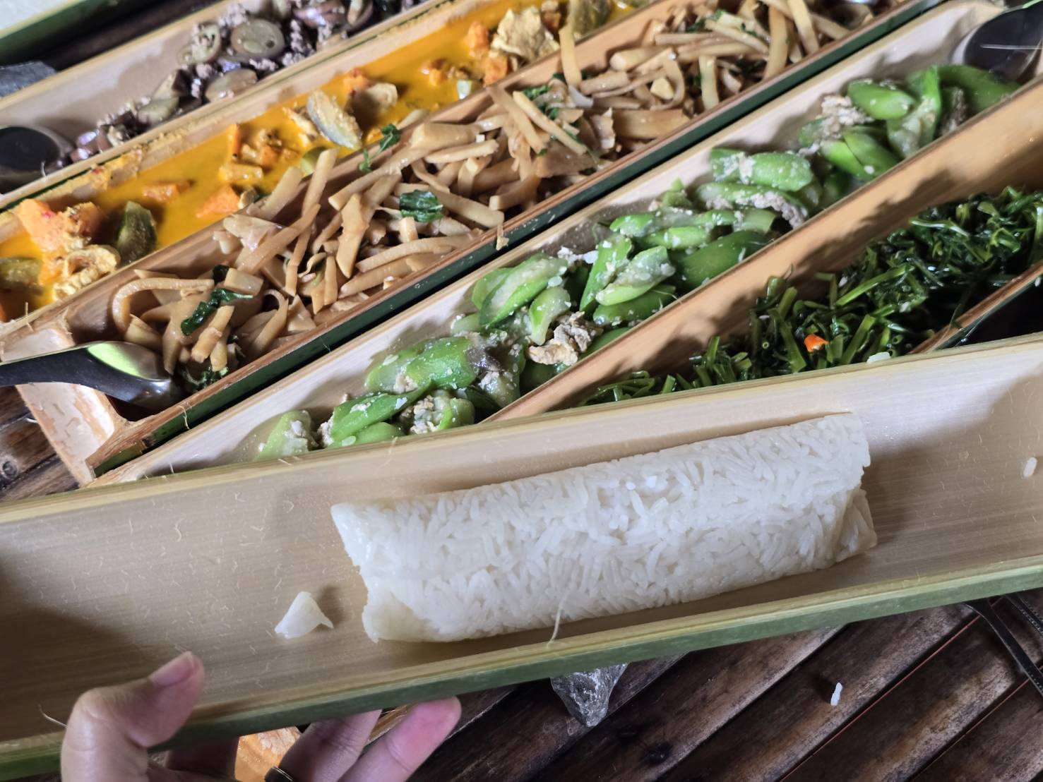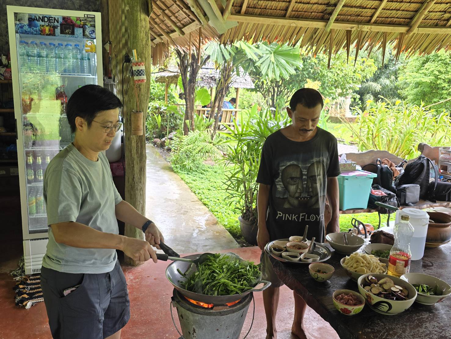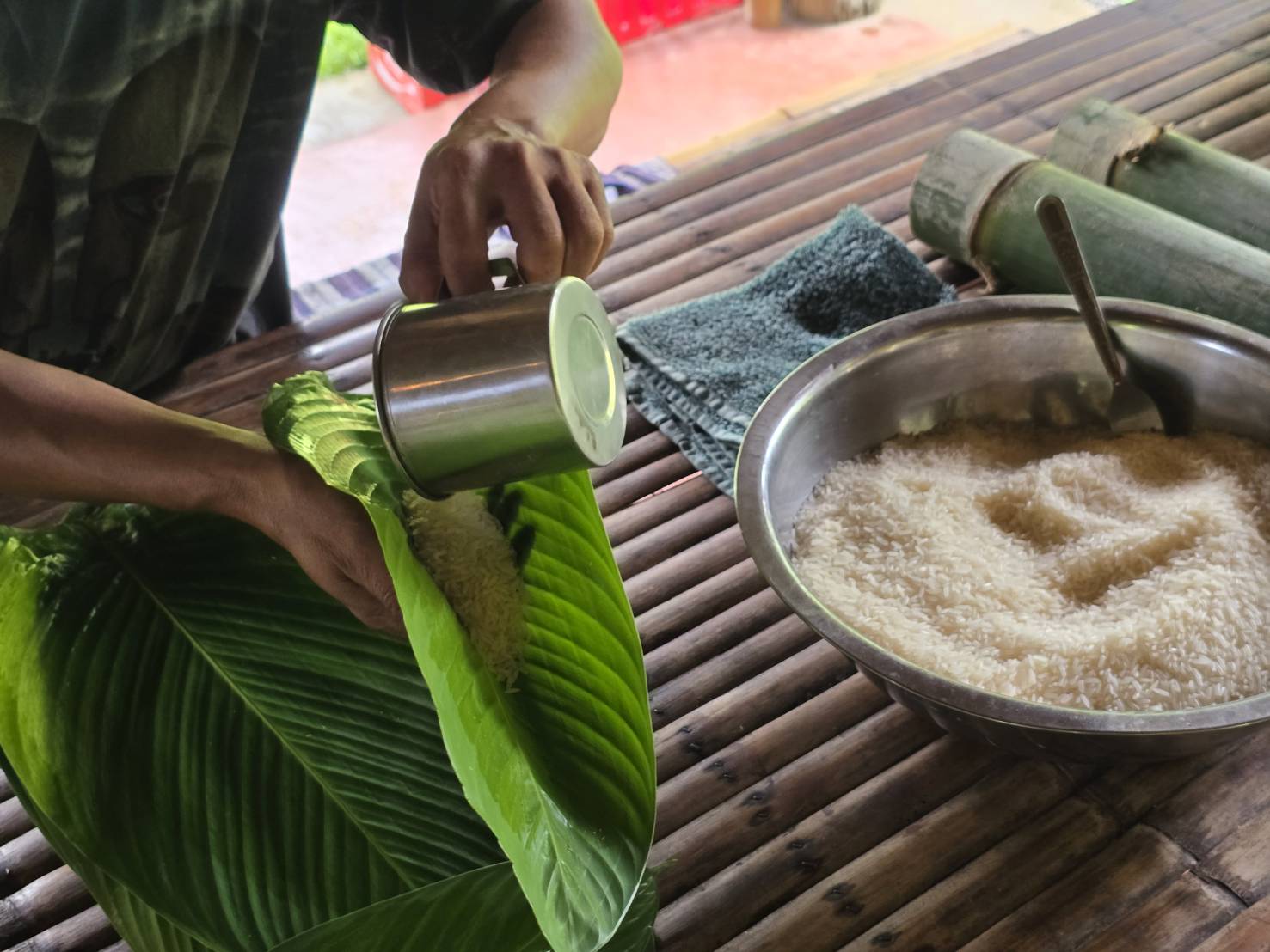 ความสนุกของที่นี่ไม่ได้มีแค่ชมสวน แต่เราได้เก็บผักด้วยตัวเอง ลองขูดมะพร้าว หุงข้าวจากใบแรดใส่กระบอกไม้ไผ่ และช่วยกันผัดกับข้าว กลิ่นหอมลอยฟุ้งไปทั่ว หลังจากนั้นก็นำกับข้าวที่ผัดเสร็จแล้วใส่ลงในกระบอกไม้ไผ่ที่ตัดแต่งเป็นถ้วยยาว ๆ แม้ลักษณะจะไม่เหมือนถ้วยธรรมดา แต่เป็นมื้ออาหารที่ทั้งลงแรงและกินจนพุงกางเลย