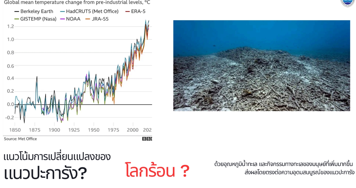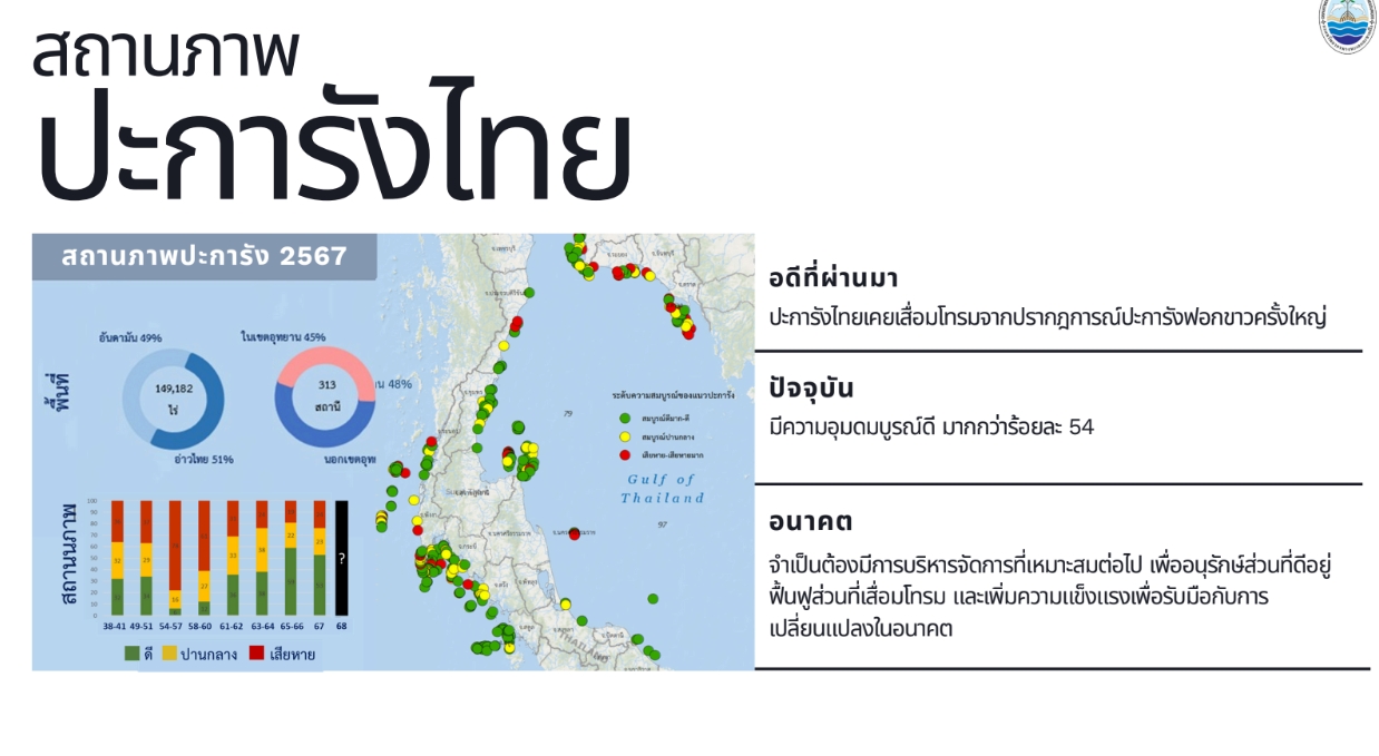 อุกกฤต สตภูมินทร์ รองอธิบดีกรมทรัพยากรทางทะเลและชายฝั่ง กล่าวว่า ทั้งโลกมีแนวปะการัง ประมาณ 4แสนตารางกม.หรือ1% ของพื้นผิวโลกแม้เพียงแค่1% จะน้อยมากแต่มีความสำคัญยิ่งใหญ่เป็นแหล่งที่อยู่อาศัยของสิ่งมีชีวิต ส่วนประเทศไทยมีพื้นที่แนวปะการัง 300 กว่าตารางกิโลเมตร ซึ่งพื้นที่ขนาดนี้มีความสำคัญมากต้องดูแลรักษา แต่ปัญหาวันนี้คือ ไทยกำลังเผชิญวิกฤติการฟอกขาวที่รุนแรง การเสื่อมโทรมของปะการัง ทั้งฝั่งอันดามันและอ่าวไทย แม้ความเสื่อมโทรมหลักๆ มาจากพฤติกรรมมนุษย์ แต่ปัญหาที่มาเร็วและมาแรง ในขณะนี้ก็คือ การเปลี่ยนแปลงสภาพภูมิอากาศ ซึ่งมีผลกระทบต่อปะการังอย่างมาก แม้ว่าตามธรรมชาติ ปะการังจะฟื้นฟูตัวเองได้ แต่ก้มีข้อกังวลว่าการฟื้นตัวภายใต้แรงบีบคั้นจากการเปลี่ยนแปลงสภาพภูมิกาศ จะทำให้ปะการังไม่สามารถฟื้นตัวเองได้เร็ว หรือฟื้นตัวเองไม่ได้ มีข้อบ่งชี้ว่า โลกเรามีการปลี่ยนแปลงสภาพภูมิอากาศ อุณหภูมิสูงขึ้น1-2% ความร้อนของโลกทำให้น้ำทะเลร้อนขึ้นไปด้วย ในไทยมีการเก็บข้อมูลจากจังหวัดภูเก็ต พบว่าน้ำทะเลมีอุณหภูมิสูงขึ้นจริงกว่าในอดีต หรือร้อนเพิ่มขึ้น 0.024 องศาฯ ต่อทศวรรษ และมีข้อมูลระบุอีกว่า ถ้าอุณหภูมิในน้ำทะเลสูงกว่า 30.1 องศา โดยเฉพาะในช่วงหน้าร้อนถ้าทะเลร้อน นานประมาณ 2-3สัปดาห์ ก็จะทำให้เกิดปะการังฟอกขาว