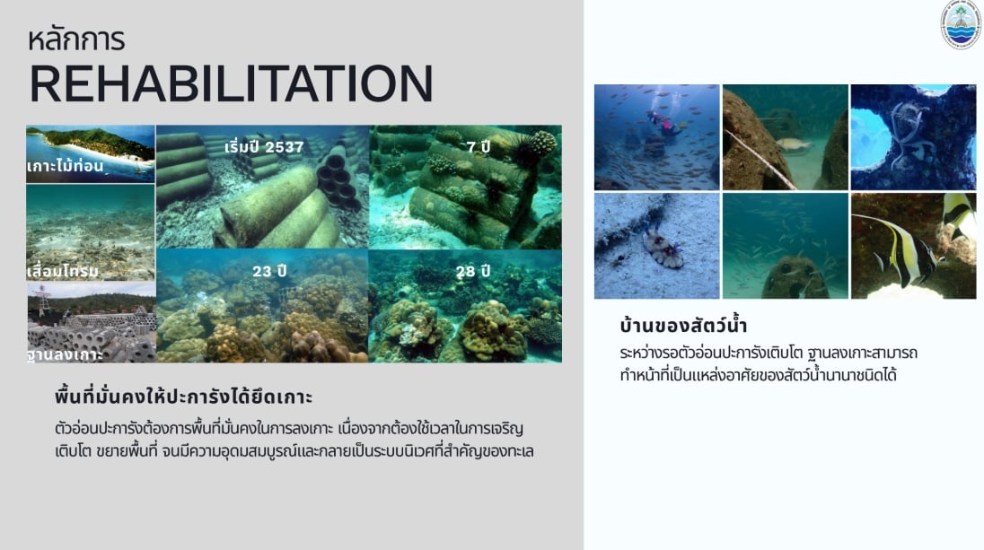 “การทำเรื่องนี้ขึ้นมา ไม่ใช่อยู่ๆ ก็ทำ แต่ทำบนฐานความรู้ การทดลองและวิจัย ว่าทำให้ปะการรังฟื้นตัวได้หรือไม่ หรือสามารถเกิดระบบนิเวศให้สัตว์น้ำอื่นๆด้วยหรือไม่ ตัวอย่างการใช้เคอนกรีต ผ่านมา 10 กว่าปี ดูไม่ออก ว่าเป็นคอนกรีน แต่เป็นการฟื้นฟูปะการังให้เป็นธรรมชาติ ทดสอบแล้วว่าหากมีการดีไซน์ดีๆ สิ่งที่ฟื้นตัวมาจะเหมือนกับธรรมชาติมาก “รองอธิบดีทช.กล่าว