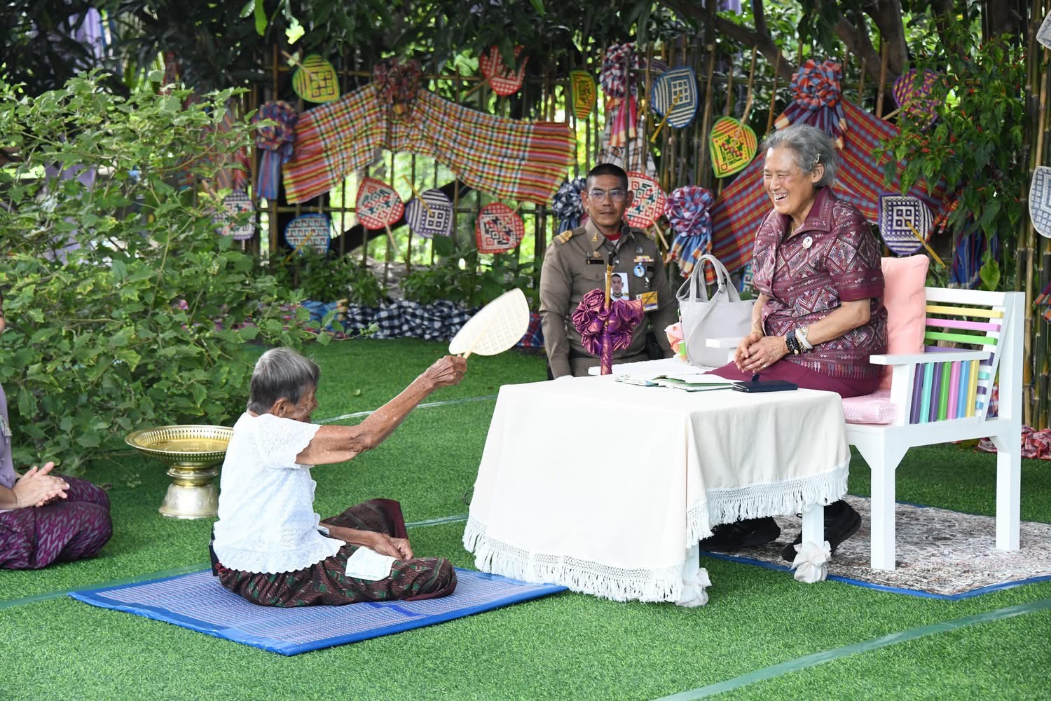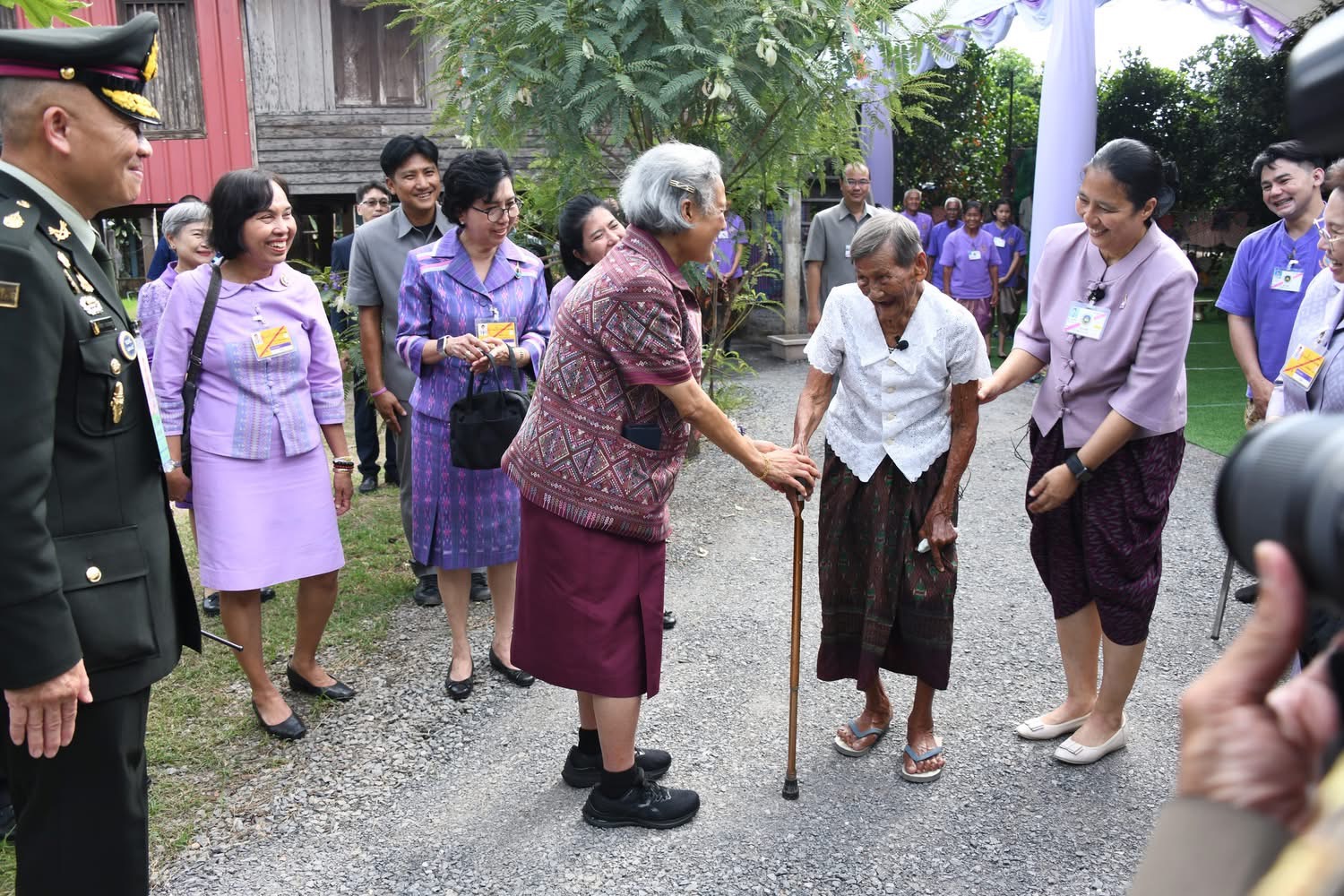 จากนั้นเสด็จฯ ถึงบ้าน นางสาวจำลอง นกยิ้ม เพื่อทรงเยี่ยม นางสาวจำลองฯ และราษฎรตำบลโก่งธนู อำเภอเมืองลพบุรี นางสาวจำลอง นกยิ้ม อายุ 97 ปี เป็นสมาชิกโครงการ “บ้านนี้มีรัก ปลูกผักกินเอง” เมื่อปี 2560 โดยได้รับพระราชทานพันธุ์ผักที่ผลิตโดยศูนย์พัฒนาพันธุ์พืชจักรพันธ์เพ็ญศิริ มูลนิธิชัยพัฒนา และเป็นต้นแบบของการปลูกทุกอย่างที่กิน กินทุกอย่างที่ปลูก หากมีเหลือก็แบ่งปัน มีสุขภาพกายและใจดี ออกกำลังกายด้วยการดูแลผักสวนครัวทุกวัน สามารถพึ่งพาตนเองได้ถึงทุกวันนี้