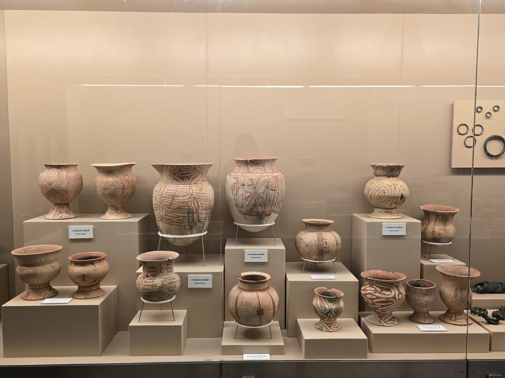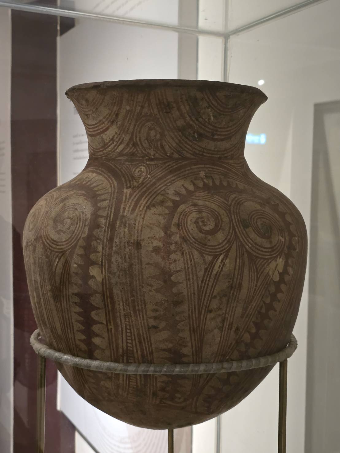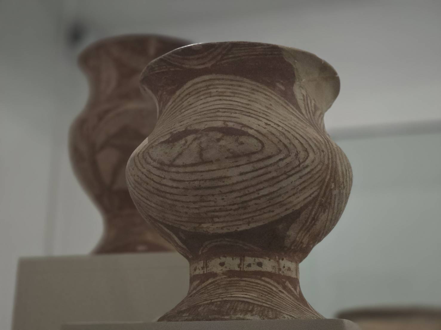 อีก 4 ชิ้นไฮไลต์ จัดอยู่ในกลุ่มภาชนะดินเผา ที่พบว่ามีการใช้ในชีวิตประจำวันและใช้ประกอบพิธีฝังศพ ลวดลายบนภาชนะมีทั้งแบบขูดขีดและประทับ ก่อนพัฒนามาเป็นการเขียนสีจากวัสดุธรรมชาติ เช่น ดินแดงหรือหินสี โดยเฉพาะสีแดงที่โดดเด่นเป็นเอกลักษณ์ ลวดลายประกอบด้วยเส้นโค้งอ่อนช้อย ก้านขด ก้นหอย รูปเรขาคณิต และรูปสัตว์ ซึ่งความสวยงามและความต่อเนื่องของเส้นโค้งเหล่านี้กลายเป็นแรงบันดาลใจให้เกิดการออกแบบลวดลายร่วมสมัย นำไปใช้กับ เครื่องปั้นดินเผา เสื้อผ้า และของที่ระลึกในปัจจุบัน