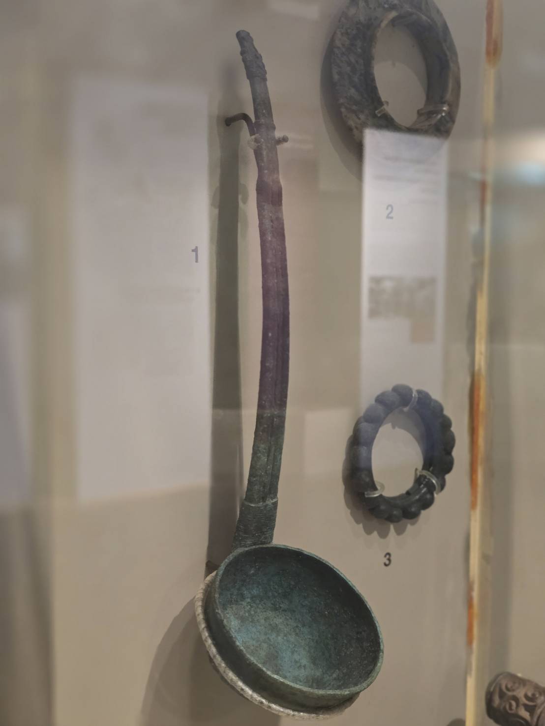 ชิ้นที่สอง “กระบวยสำริด” เป็นชิ้นเดียวที่พบในไทย ใบหอก การเชื่อมต่อของวัฒนธรรมในการใช้เหล็กกับสำริดมีความสมบูรณ์ที่สุด มีลวดลายปรากฏอยู่ เป็นลายคล้ายๆ ก้นหอย ที่แสดงออกถึงความเป็นเอกลักษณ์เฉพาะของบ้านเชียง หากย้อนหลับไปเมื่อ 1,000-2,000 ปีก่อน ช่างที่ทำจะต้องมีความรู้และความสามารถด้านการหล่อโลหะค่อนข้างสูง จึงสามารถหล่อกระบวยออกมาเป็นรูปทรงที่สวยงามได้