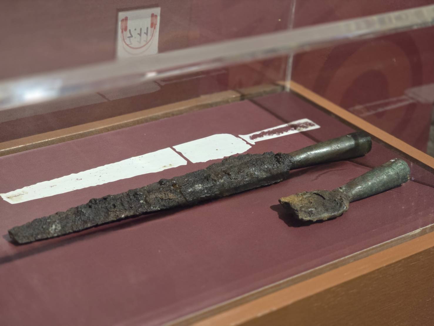 ชิ้นที่สาม “ใบหอก” แสดงให้เห็นถึงวิวัฒนาการของการใช้โลหะของแหล่งโบราณคดีบ้านเชียง หากสังเกตใกล้ๆ จะเห็นว่าใบหอกจะมีความขรุขระเนื่องจากสนิมเหล็ก แต่ส่วนที่เป็นด้ามหอกจะไม่ขรุขระแต่เป็นสีเขียว ซึ่งเกิดจากสนิมสำริด แสดงว่าเป็นโลหะสองชนิดที่เชื่อมเข้าด้วยกันคือ เหล็กกับสำริด โดยยุคของสำริดมาก่อนยุคเหล็ก เมื่อคนนิยมใช้เหล็กมากขึ้น สำริดก็ได้รับความนิยมน้อยลง เนื่องจากเหล็กมีความแข็งแรงมากกว่า ฉะนั้นการเจอโลหะสองชนิดเชื่อมเข้าด้วยกันแสดงว่ามีการเชื่อมต่อของวัฒนธรรมในการใช้เหล็กกับสำริด