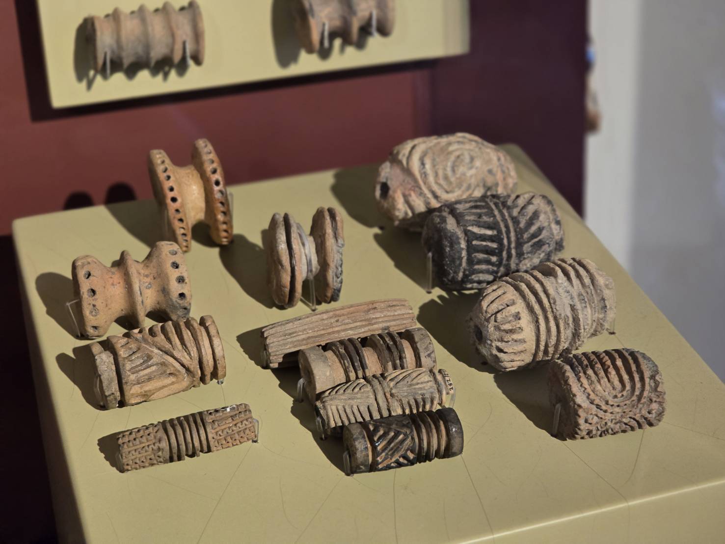 ชิ้นที่ห้า “ลูกกลิ้งดินเผา” เป็นโบราณวัตถุที่อยู่ในช่วงสมัยปลาย (Late Period) มีอายุระหว่าง 2,300-1,800 ปีมาแล้ว มีข้อสันนิษฐานที่สอดคล้องกันว่า ลูกกลิ้งดินเผาบ้านเชียงใช้กลิ้งลายบนภาชนะดินเผา แต่เพราะลวดลายบนภาชนะดินเผาบ้านเชียงสมัยปลายเป็นลวดลายที่เกิดจากการเขียนด้วยพู่กัน และไม่ปรากฎลวดลายบนภาชนะดินเผาที่เกิดจากลายของลูกกลิ้ง อีกทั้งรูปร่างขนาดใหญ่ของลูกกลิ้งไม่สามารถใช้กลิ้งหรือพิมพ์ลวดลายบนภาชนะดินเผาได้ จึงเกิดสมมติฐานที่ว่าเป็นเครื่องมือกลิ้งลวดลายบนผืนผ้า