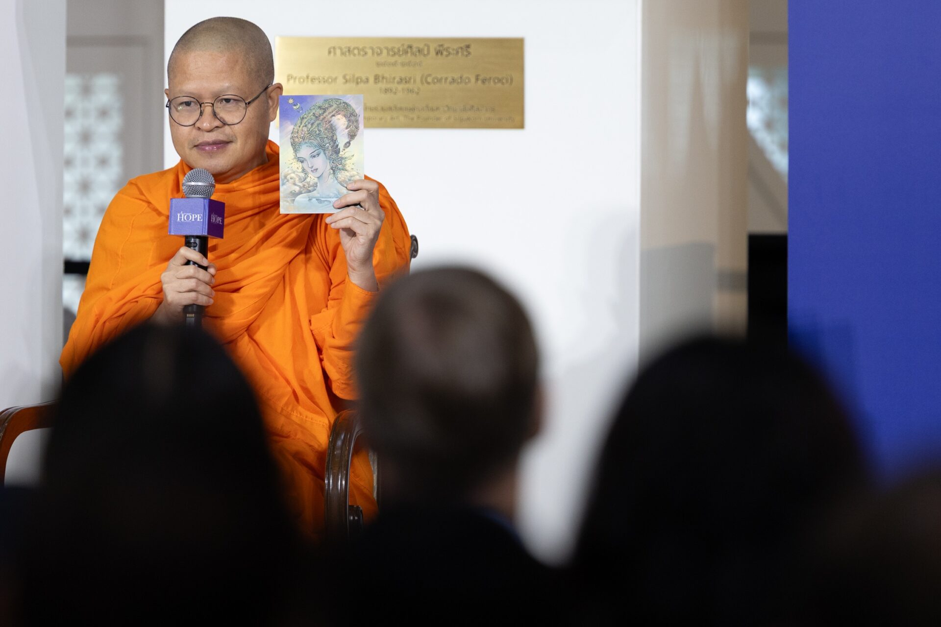 ท่าน ว.วชิรเมธี กล่าวว่า นิทรรศการ “ศิลปกรรมเพื่อผู้ลี้ภัย” เริ่มต้นขึ้น 8 ปีที่แล้ว ขณะนั้นจำนวนผู้ลี้ภัยมี 80 ล้านคน ปัจจุบันสถานการณ์ผู้ลี้ภัยก็ไม่ได้ดีขึ้น ตัวเลขกลับเพิ่มมากขึ้น นอกจากในค่ายผู้ลี้ภัยแล้ว ยังกระจายทั่วทุกแห่งปัญหาผู้ลี้ภัยในภูมิภาคต่างๆ ของโลกเชื่อมโยงเป็นอันหนึ่งอันเดียวกัน และส่งผลกระทบต่อไทยเราไม่อาจอยู่เฉยกับวิกฤตการณ์ของโลกที่เกิดขึ้นไทยเองก็เจอปัญหาหนัก อยากชวนทุกคนเยียวยาโลกใบนี้ มองโลกอย่างมีความหวังดั่งชื่อนิทรรศการ เพราะหากสิ้นหวังจะปล่อยปละละเลยและยอมจำนน แต่ถ้ามองโลกแบบมีความหวังจะเกิดพลังพิเศษสานพลังกันเยียวยาปัญหา
