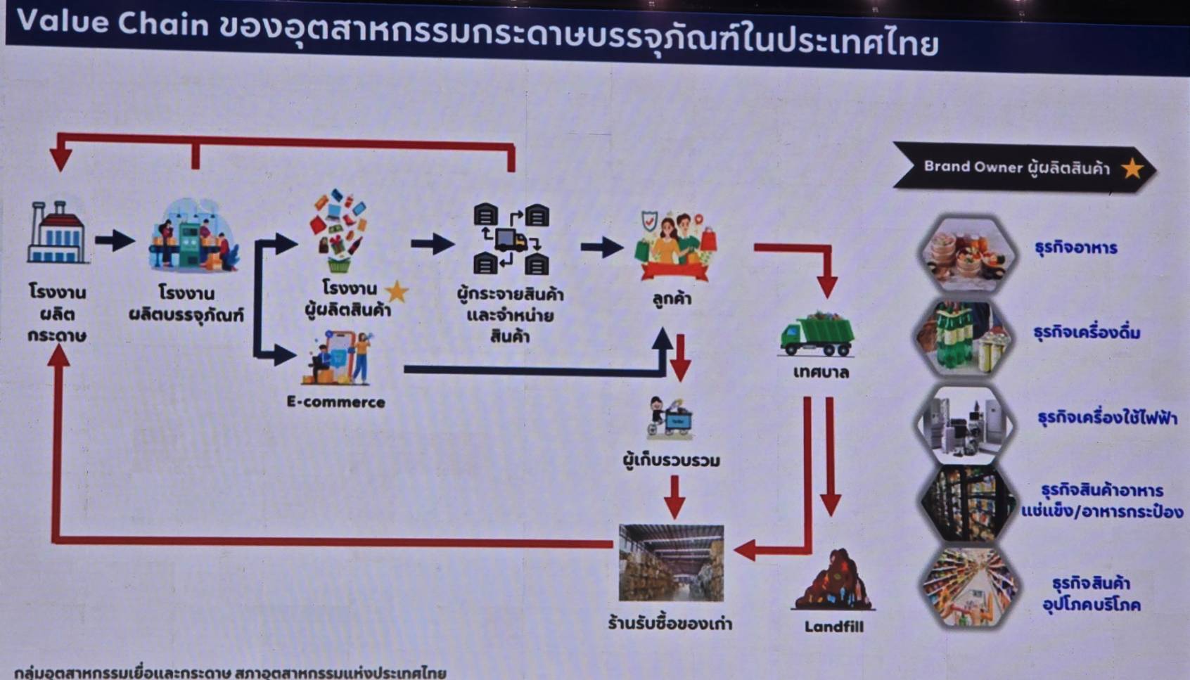 สุนทร กล่าวว่า ภาพรวมระดับประเทศ บรรจุภัณฑ์กระดาษที่ผลิตและส่งมอบให้คู่ค้า มีทั้งจำหน่ายภายในประเทศและส่งออก โดยเฉพาะในภูมิภาคอาเซียนที่สัดส่วนการส่งออกมีจำนวนมาก ส่งผลให้บรรจุภัณฑ์กระดาษบางส่วนติดไปกับสินค้าออกนอกประเทศ สำหรับในประเทศจากข้อมูลสถิติและงานวิจัยของมหาวิทยาลัยเกษตรศาสตร์ พบว่าอัตราการเก็บกลับของกระดาษแข็งและกระดาษลังอยู่ที่ประมาณ 70% เมื่อเปรียบเทียบกับต่างประเทศ เช่น ญี่ปุ่น ซึ่งสามารถเก็บกลับได้มากกว่า 85% จะเห็นว่ายังมีศักยภาพในการพัฒนาต่อส่วนกระดาษที่ยังหลุดรอดไปสู่ระบบจัดการขยะของเทศบาล เป็นส่วนที่ยังต้องปรับปรุง ขณะที่อุตสาหกรรมการผลิตยังคงพึ่งพาการนำเข้ากระดาษรีไซเคิลจากต่างประเทศ เพื่อรักษาสัดส่วนการใช้วัตถุดิบรีไซเคิลในกระบวนการผลิตให้มากกว่า 90%