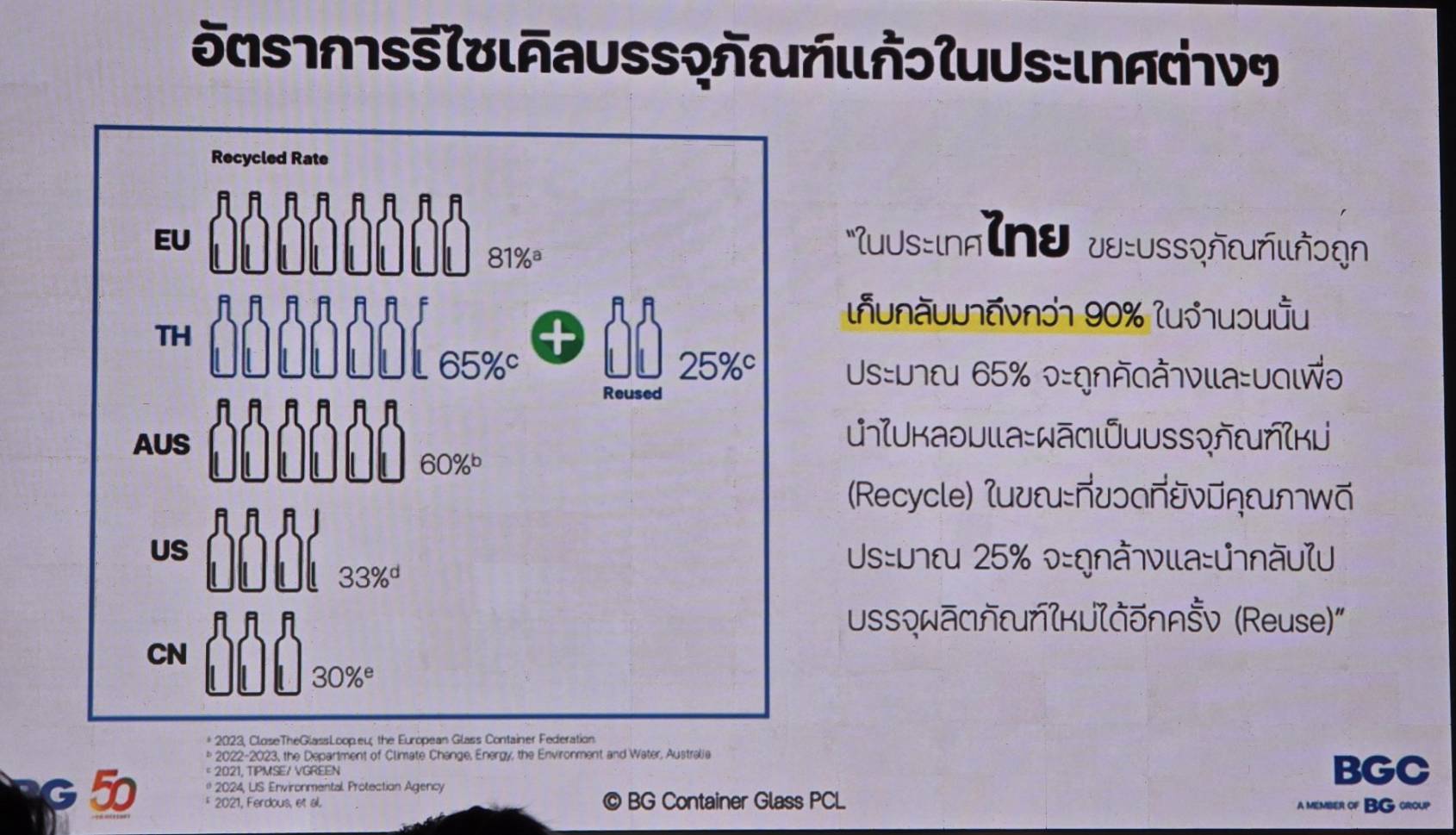 ดร.รณรพี ลีละวงศ์ ผู้อำนวยการสำนักกลยุทธ์องค์กรและความยั่งยืน บริษัท บีจี คอนเทนเนอร์ กล๊าส จำกัด (มหาชน) กล่าวถึงภาพรวมการเก็บกลับบรรจุภัณฑ์ขวดแก้วว่า ประเทศไทยไม่ได้ด้อยกว่าประเทศอื่นในด้านการรีไซเคิล โดยเฉพาะการรีไซเคิลแก้ว เพราะในไทยขวดแก้วถูกเก็บกลับมากว่า 90% ในจำนวนนี้ 65% จะถูกคัดล้างและบดเพื่อนำไปหลอม ผลิตเป็นบรรจุภัณฑ์ใหม่ ในขณะที่ขวดคุณภาพดีประมาณ 25% จะถูกล้างและนำกลับไปเป็นบรรจุภัณฑ์ใหม่อีกครั้ง ซึ่งถือว่าอยู่ในระดับสูงเมื่อเทียบกับหลายประเทศ แม้จะยังต่ำกว่าทวีปยุโรปบ้าง เนื่องจากยุโรปมีระบบและกลไกการคัดแยกที่พัฒนาแล้ว