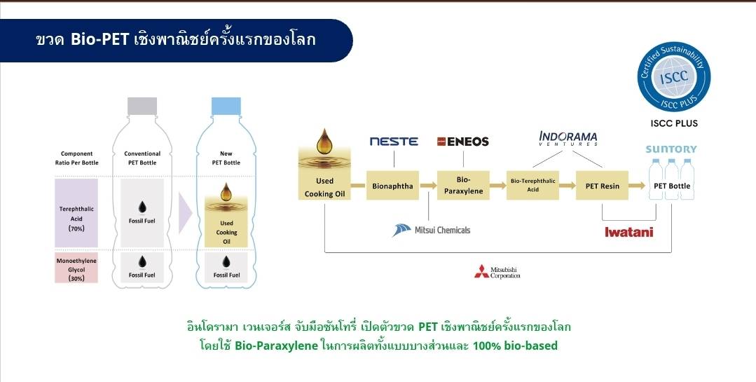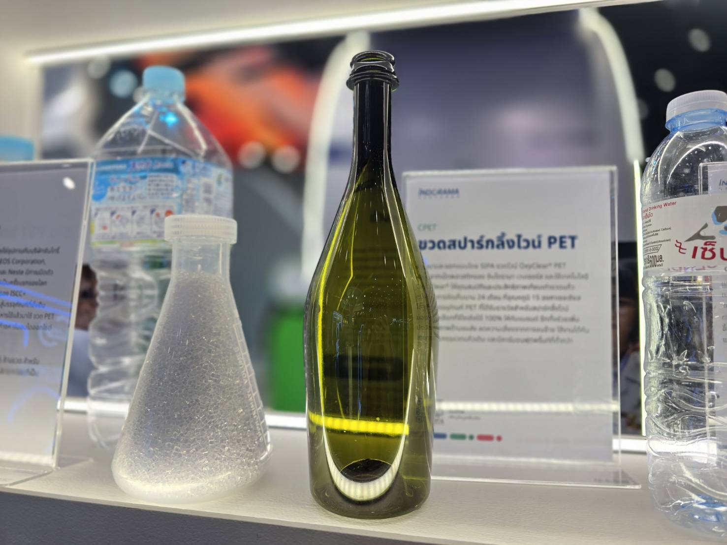 ดร.แอนโทนี กล่าวถึงผลิตภัณฑ์ยั่งยืนอย่าง Bio-PET ที่ได้ร่วมกับซันโทรี่ ในการใช้เทคโนโลยีพาราไซลีนเชิงชีวภาพ (bio-paraxylene) มาผลิตกรดเทเรฟทาลิกเชิงชีวภาพ (bio-terephthalic acid) และนำไปทำปฏิกิริยากับโมโนเอทิลีนไกลคอล (MEG) เพื่อผลิตเม็ดพลาสติก PET ทั้งแบบบางส่วนและ 100% bio-based ที่ได้รับการรับรองมาตรฐาน ISCC PLUS อย่างเป็นทางการ กลับคงคุณสมบัติทางเทคนิคเหมือนเดิมกับ PET ปกติ สามารถช่วยลดคาร์บอนฟุตพริ้นท์ได้อย่างมีประสิทธิภาพ ตั้งแต่ต้นทางของกระบวนการผลิต อีกหนึ่งนวัตกรรมคือ ขวด PET สำหรับไวน์มีฟอง (Sparkling Wine) โดยใช้เทคโนโลยี OxyClear ซึ่งถือเป็นขวด PET ชนิดแรกสำหรับผลิตภัณฑ์ประเภทนี้ ขวดนี้มีลักษณะคล้ายขวดแก้วสีเขียว โปร่งแสงและสวยงาม แต่มีน้ำหนักเบากว่า รีไซเคิลได้ 100% และมีคาร์บอนฟุตพริ้นท์ต่ำกว่าขวดแก้ว ขณะเดียวกันยังคงคุณสมบัติในการรักษาความสดของไวน์ได้อย่างมีประสิทธิภาพ