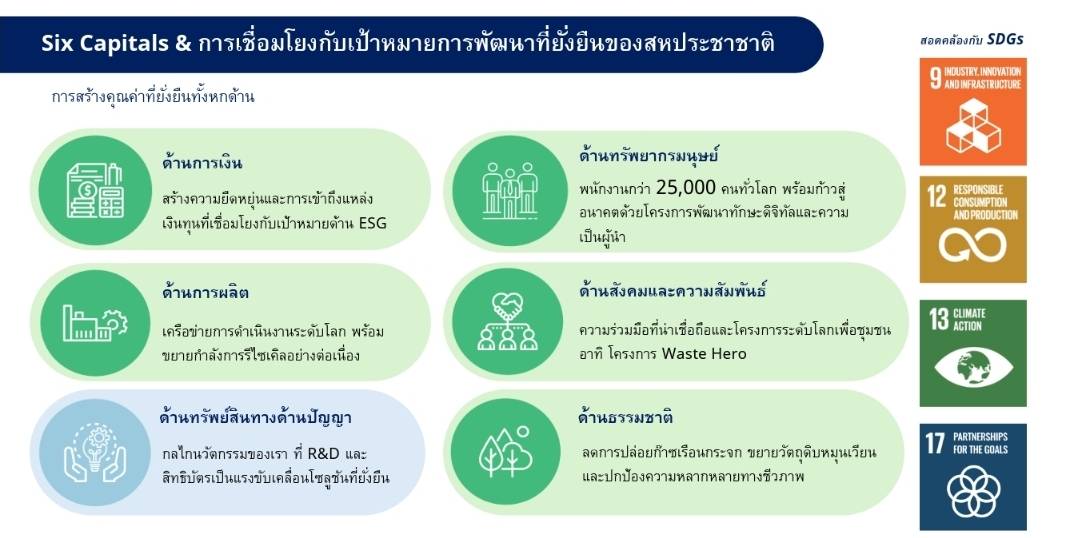 3.ด้านทรัพยากรมนุษย์ (Human Capital) มุ่งพัฒนาศักยภาพบุคลากรกว่า 25,000 คนทั่วโลก ผ่านโปรแกรมเสริมสร้างทักษะและความพร้อม เพื่อขับเคลื่อนองค์กรด้วยพลังของคนและเตรียมความพร้อมสู่อนาคต4.ด้านสังคมและความสัมพันธ์ (Social & Relationship Capital) ดำเนินโครงการให้ความรู้ด้านการรีไซเคิล เช่น โครงการ Waste Hero ที่ให้ความรู้แก่ประชาชนกว่า 1.1 ล้านคน ครอบคลุม 1,360 โรงเรียนและมหาวิทยาลัย รวมถึงสร้างความร่วมมือระดับโลกกับภาครัฐ องค์กรพัฒนาเอกชน (NGOs) และพันธมิตรในอุตสาหกรรม เพื่อร่วมกันขับเคลื่อนเศรษฐกิจหมุนเวียน