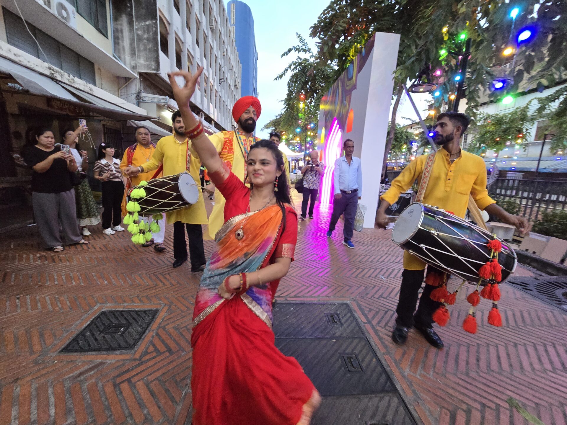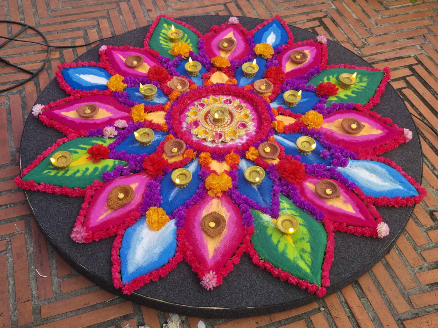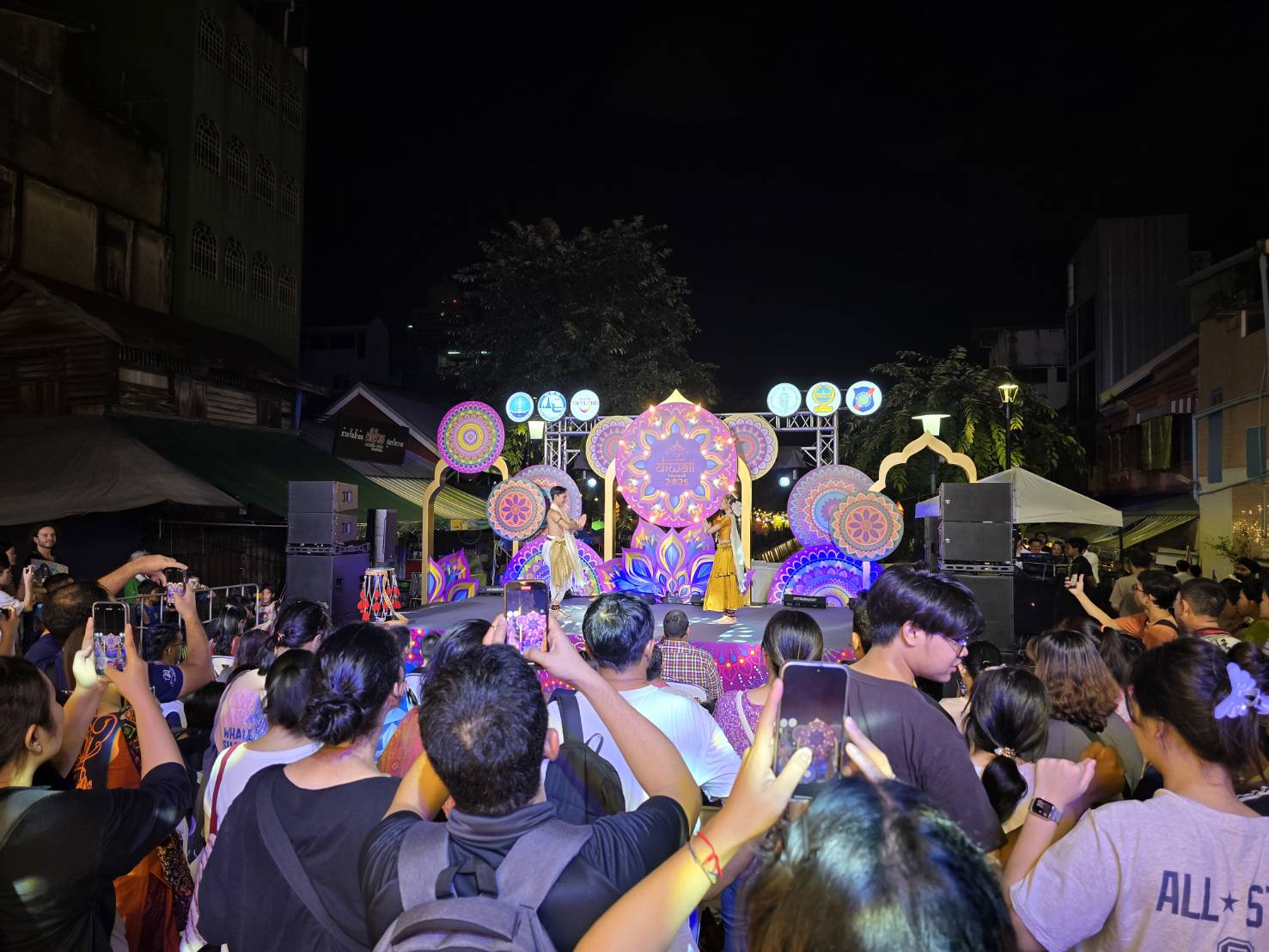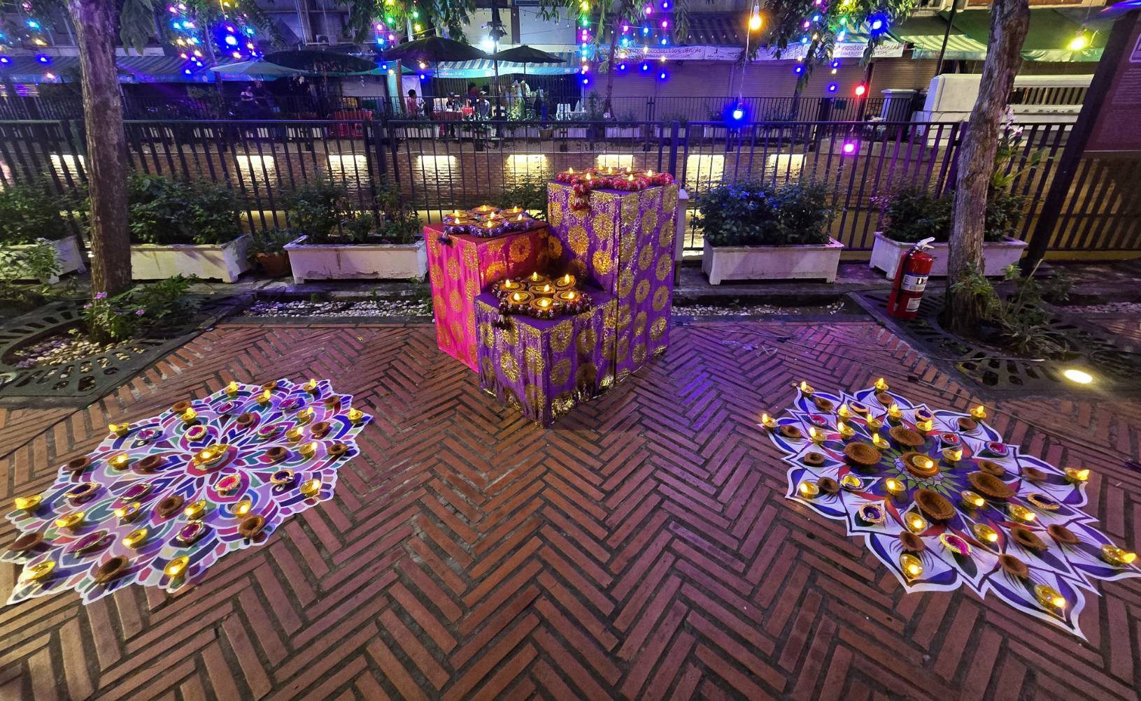 ความงดงามของวัฒนธรรมอินเดียเปล่งประกายอยู่ที่คลองโอ่งอ่างและย่านพาหุรัดในยามเย็น เมื่อแสงแดดโรยราตกกระทบ ผู้คนเริ่มออกมาเฉลิมฉลองท่ามกลางแสงไฟระยิบระยับจากเทียน โคมไฟ และการตกแต่งไฟที่ส่องประกายตลอดแนวคลองและตรอกซอยของพาหุรัด ภายในงานเต็มไปด้วยการประดับตกแต่งที่สะท้อนเอกลักษณ์ของอินเดีย เมื่อเดินเข้าสู่งาน หากสังเกตให้ดีจะพบกับ “รังโกลี” ศิลปะพื้นบ้านของอินเดีย ซึ่งเป็นการสร้างลวดลายหลากสีสันบนพื้น โดยปกติใช้วัสดุต่าง ๆ เช่น ทราย กลีบดอกไม้ แป้งข้าวเจ้า หรือถั่ว