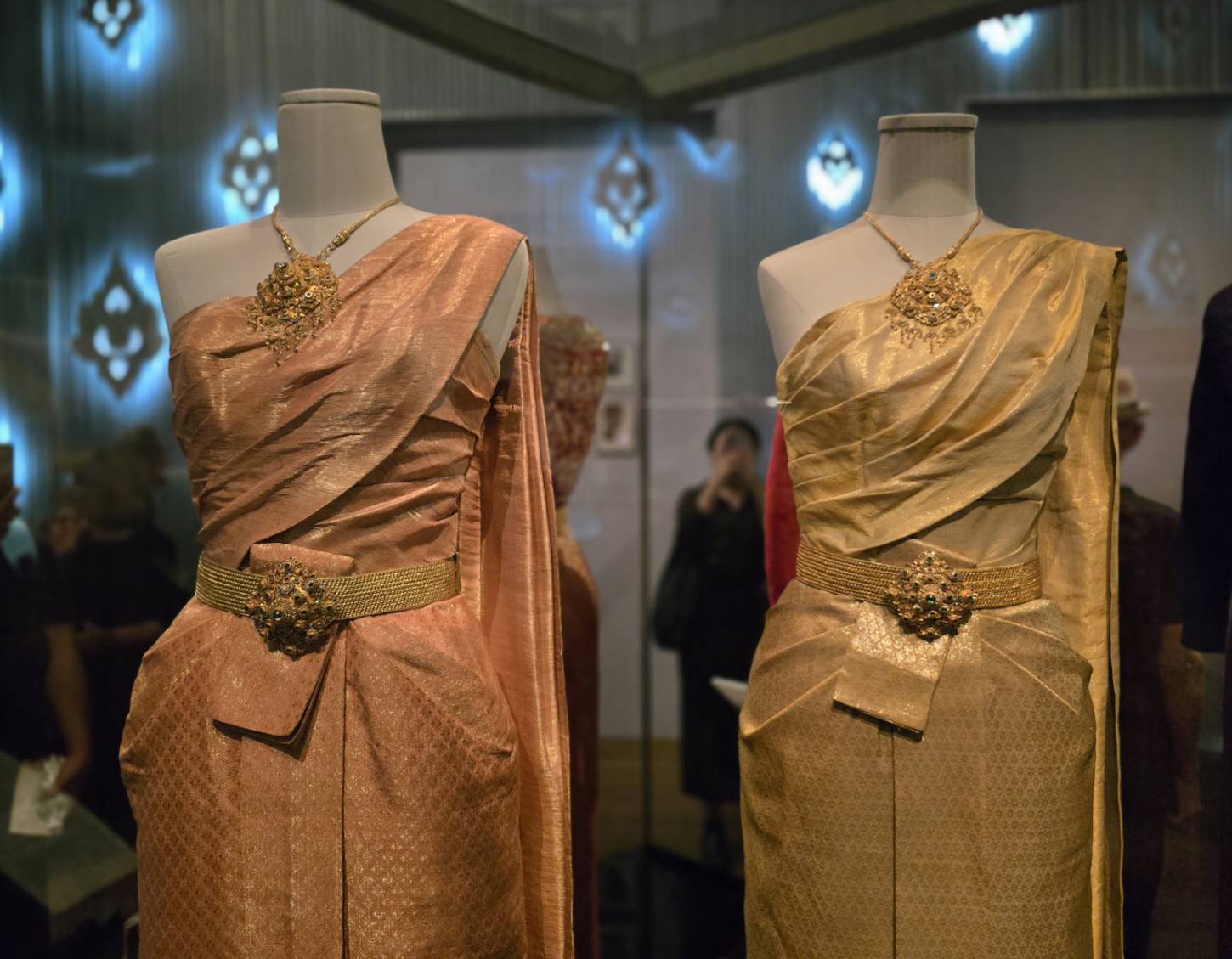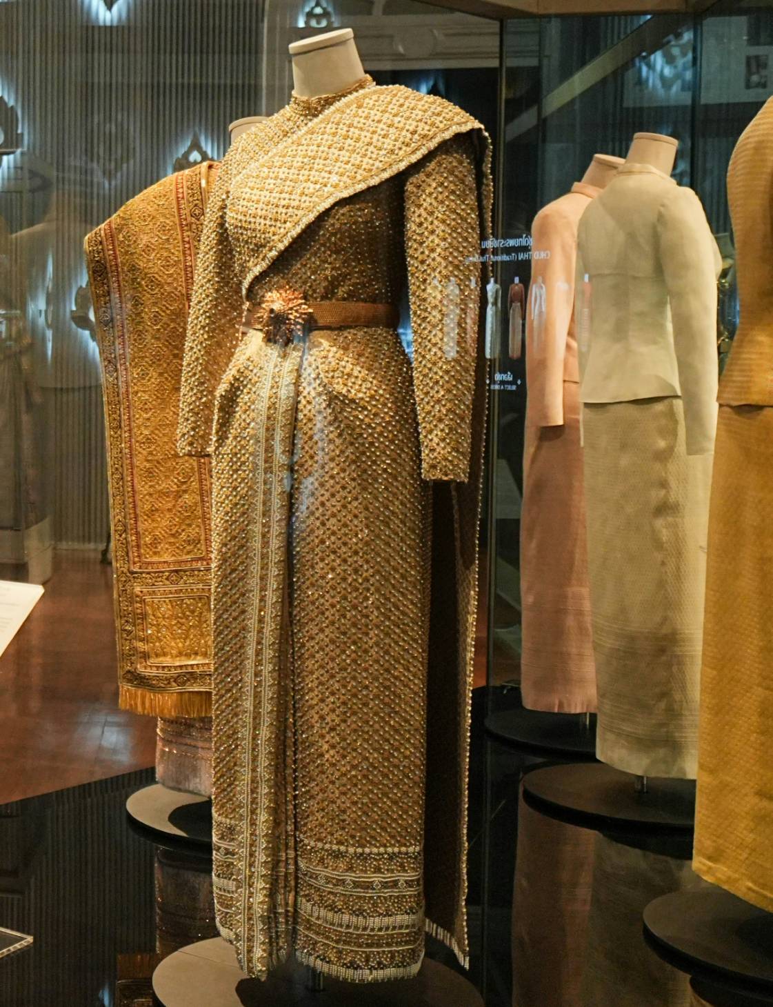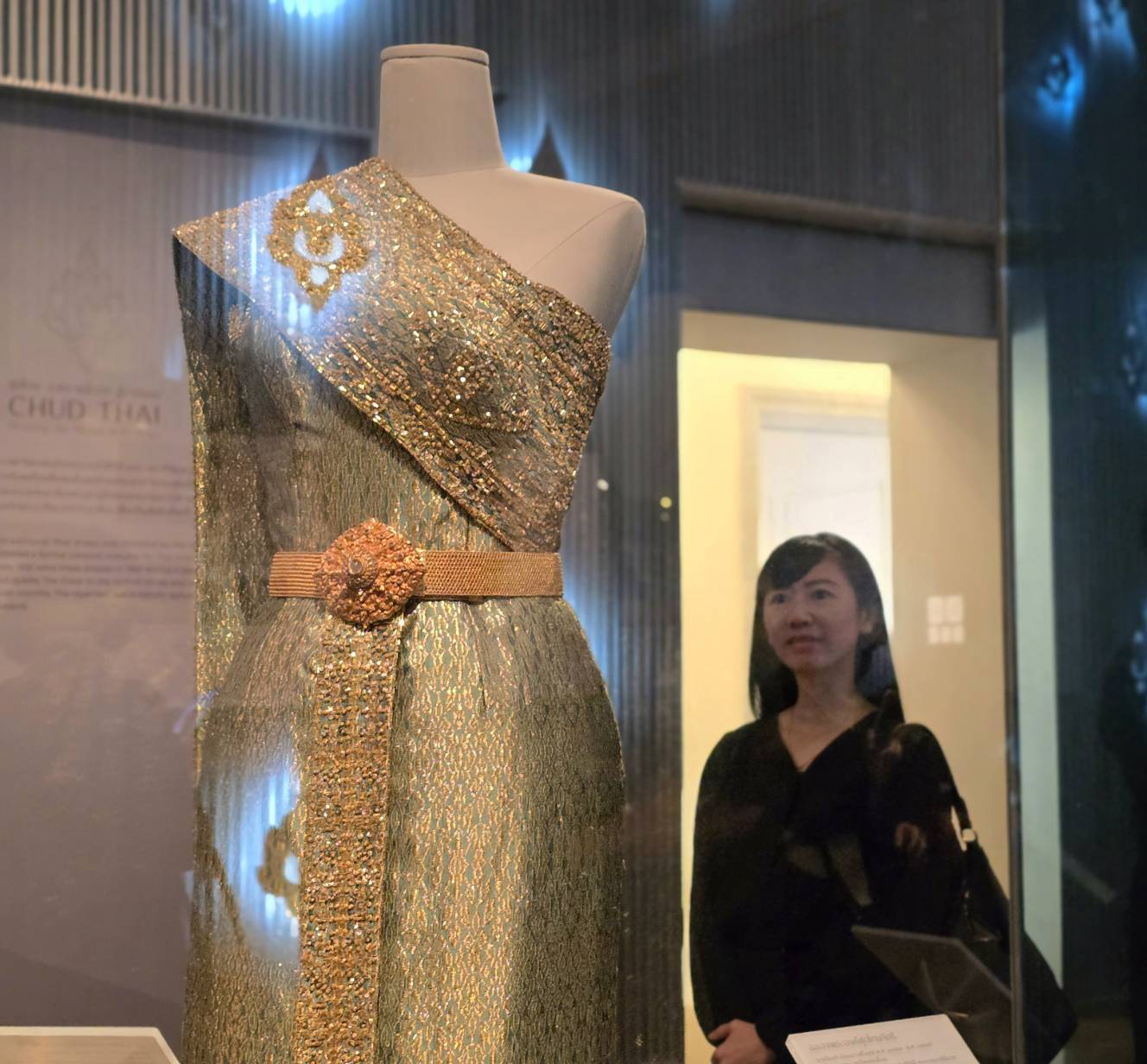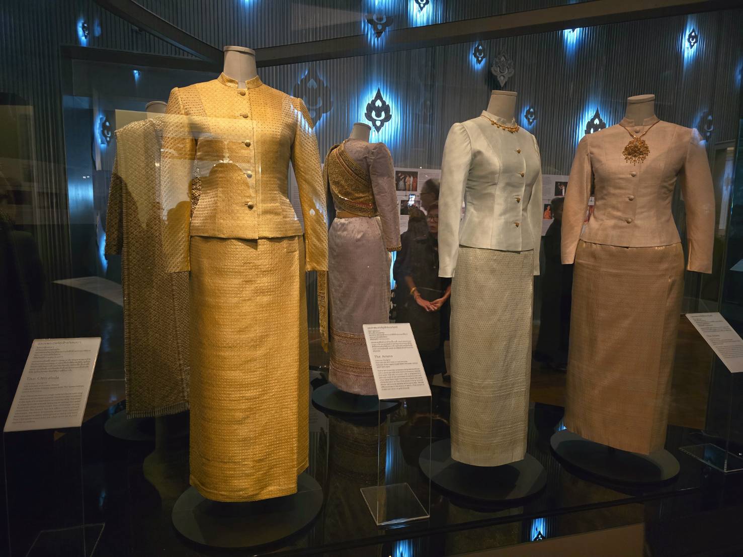 ภายในห้องจัดแสดงที่ 1 ของพิพิธภัณฑ์ผ้าฯ ได้จัดแสดงฉลองพระองค์ชุดไทยพระราชนิยมของสมเด็จพระบรมราชชนนีพันปีหลวง นางสาวศาสตรัตน์ มัดดิน หัวหน้าแผนกภัณฑารักษ์และการศึกษา ได้เล่าให้ฟังถึงจุดเริ่มต้นของชุดไทยพระราชนิยมว่า ในปี พ.ศ. 2503 สมเด็จพระบรมราชชนนีพันปีหลวง โดยเสด็จ พระบาทสมเด็จพระเจ้าอยู่หัว รัชกาลที่ 9 ไปทรงเจริญพระราชไมตรีกับสหรัฐอเมริกาและประเทศต่าง ๆ พระองค์ทรงตระหนักว่าการปรากฏพระองค์ในฐานะสมเด็จพระราชินีแห่งไทย ควรสะท้อน เอกลักษณ์ของชาติอย่างสง่างามและร่วมสมัย ขณะนั้นสตรีไทยยังไม่มีเครื่องแต่งกายที่เป็นแบบแผนแน่นอน จึงมีพระราชดำริให้ตั้งคณะทำงานขึ้น ประกอบด้วย พระยาอนุมานราชธน และ สมศรี สุกุมลนันทน์ เพื่อร่วมกันออกแบบ เครื่องแต่งกายไทยร่วมสมัย โดยมีพระองค์ทรงให้คำแนะนำอย่างใกล้ชิด ทั้งการเลือกผ้าทอไทยและเครื่องประดับที่เหมาะสม