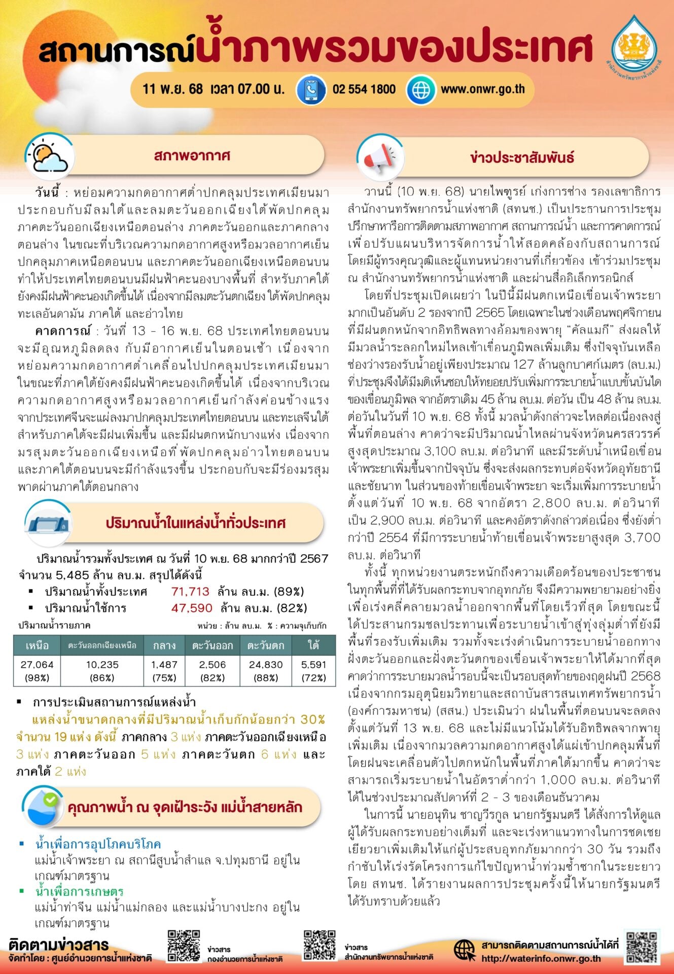 สำนักงานทรัพยากรน้ำแห่งชาติ (สทนช.) สรุปสถานการณ์น้ำภาพรวมของประเทศ วันที่ 23 พ.ย. 68 เวลา 7.00 น.