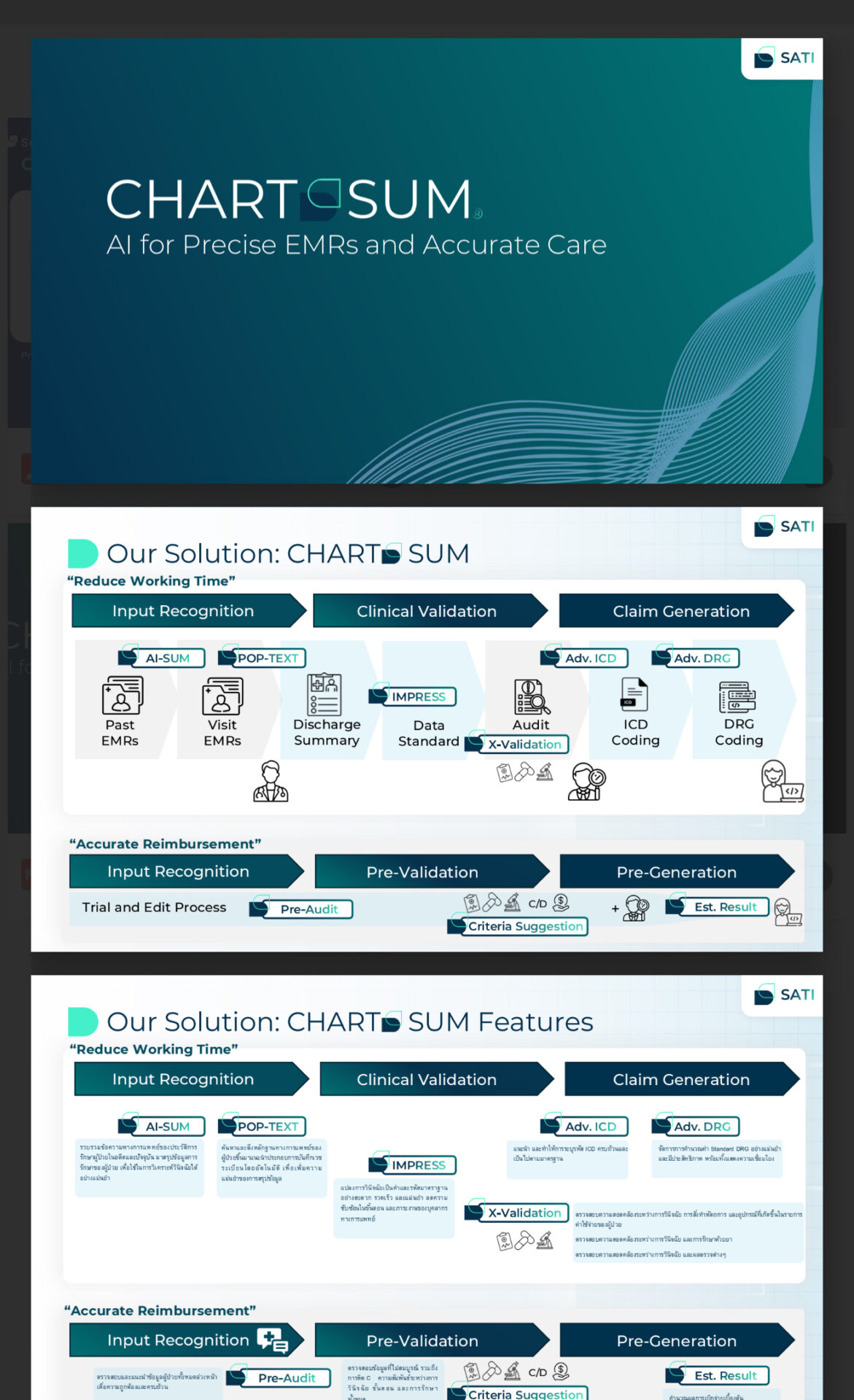 ข้อความข้างต้น เป็นแรงบันดาล ทำให้เกิด “สาติ “ซึ่งมีโปรแกรมที่เรียกว่า “ChartSum – AI “แพลตฟอร์มอัจฉริยะ ทำหน้าที่ ประมวลผลข้อมูลทางคลินิก ช่วยสรุปและตรวจสอบเวชระเบียนอิเล็กทรอนิกส์ (EMRs) แบบอัตโนมัติ ความสามารถหลักๆ ก็มีดังนี้ คือ เพิ่มความถูกต้องของการเบิกจ่าย ด้วยระบบรหัสมาตรฐาน (ICD, DRG, SNOMED-CT เป็นต้น ช่วยลดระยะเวลาในการทำงาน ด้วยระบบช่วยสรุปชาร์ตและตรวจสอบการเบิกจ่ายอัตโนมัติ ลดข้อผิดพลาด ด้วยการตรวจสอบความสอดคล้องระหว่างการวินิจฉัย การสั่งหัตถการ ยา และรายการค่าใช้จ่าย นอกจากนี้ ChartSum ยังสามารถเชื่อมต่อกับระบบสารสนเทศโรงพยาบาล (HIS) ขั้นนำ เช่น HOSxP ภายในระยะเวลา 4 สัปดาห์ และสามารถปรับใช้กับระบบ HIS อื่น ๆ ด้วยเช่นกัน