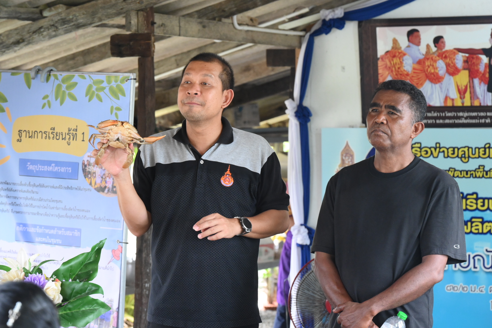 “จะเห็นได้ว่าปูที่นี่แกะกระดองออกมาแล้ว นมจะขาวไม่มีขี้โคลนดำๆ เป็นเพราะระบบการจัดการบ่อเลี้ยงไม่ให้ใต้บ่อมีโคลนดำ ๆ ซึ่งเป็นการทำงานของจุลินทรีย์ ส้งเคราะห์แสง ที่เราไปสอนให้ชาวบ้านทำใช้เอง ช่วยลดต้นทุน เพราะถ้าไปซื้อจะมีต้นทุนอีกแบบ”ดร.กิตติชนม์ กล่าว