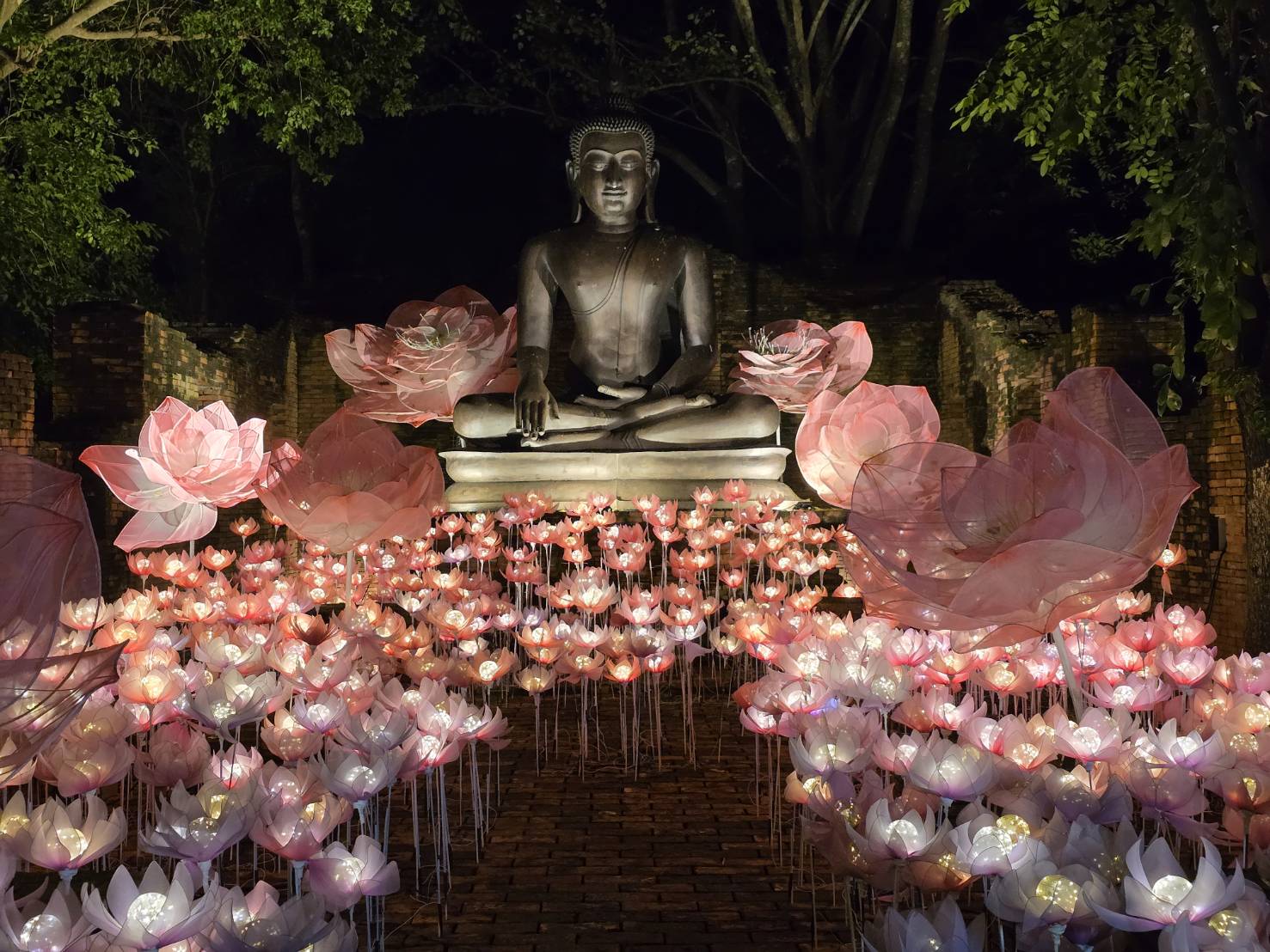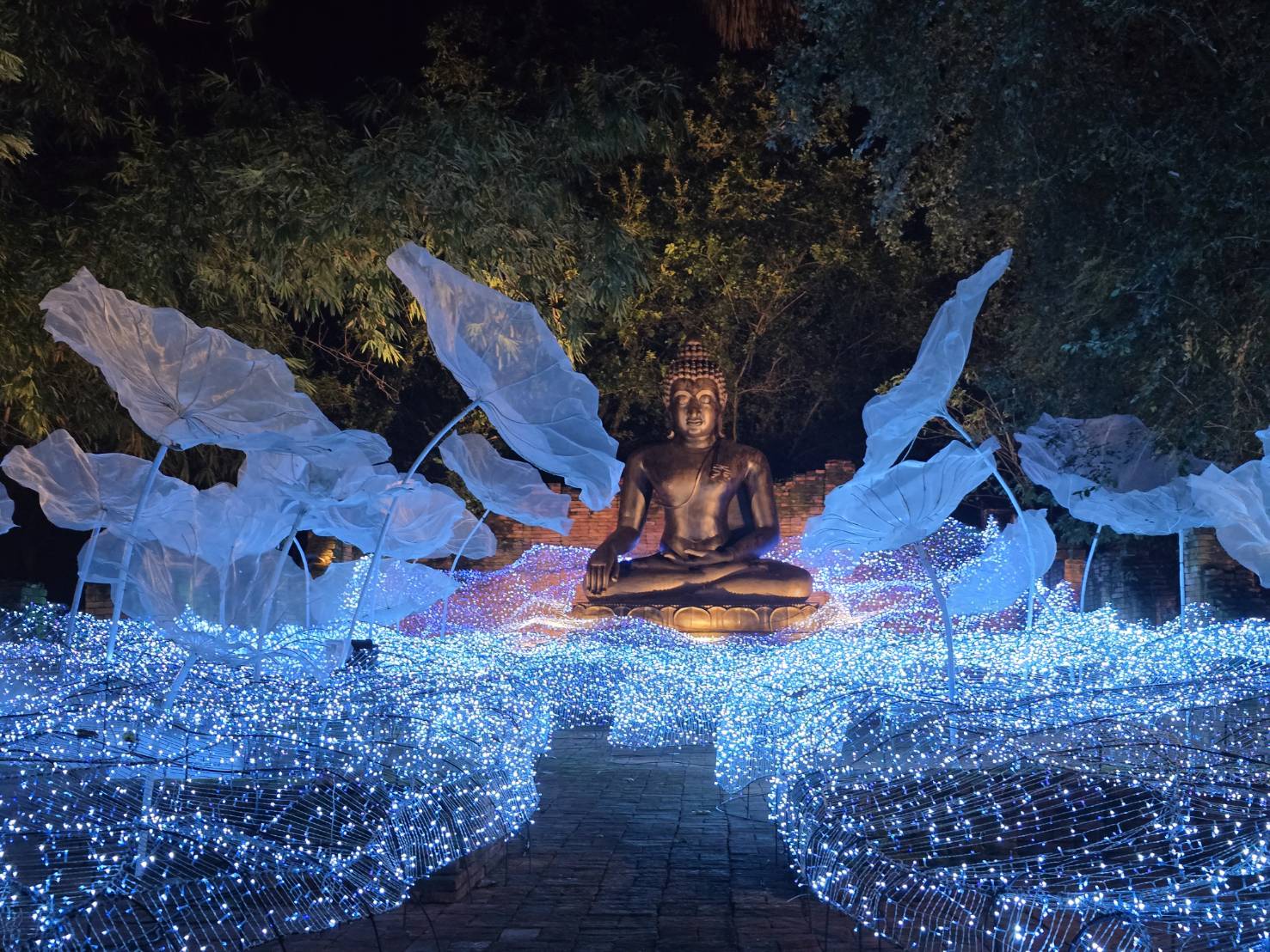 เมื่อเดินทางมาชมงานจัดแสดงไฟ บอกได้เลยว่าช่วงเวลาที่เหมาะที่สุดคือ ยามค่ำคืน เพราะทันทีที่ฟ้าเริ่มมืด แสงไฟนับล้านดวงจะค่อยๆ เปล่งประกาย เปลี่ยนบรรยากาศรอบตัวให้เต็มไปด้วยมนต์เสน่ห์ที่น่าตื่นตา ปีนี้ ณ สัทธา ยังคงเตรียม จุดถ่ายภาพมากถึง 24 โซน ประกอบด้วย โซน 1 Thai Glorious Era สรรเสริญคุณพระมหากษัตริย์ไทยผู้ปรีชาทั้ง 3 พระองค์ ได้แก่ พระนเรศวรมหาราช พระเจ้าตากสินมหาราช และสมเด็จพระจุลจอมเกล้าเจ้าอยู่หัว รัชกาลที่ 5, โซน 2 Season Change, โซน 3 Rice Memory รวงข้าว แผ่นดินทอง, โซน 4 Dream Scape (ภาพฝัน)