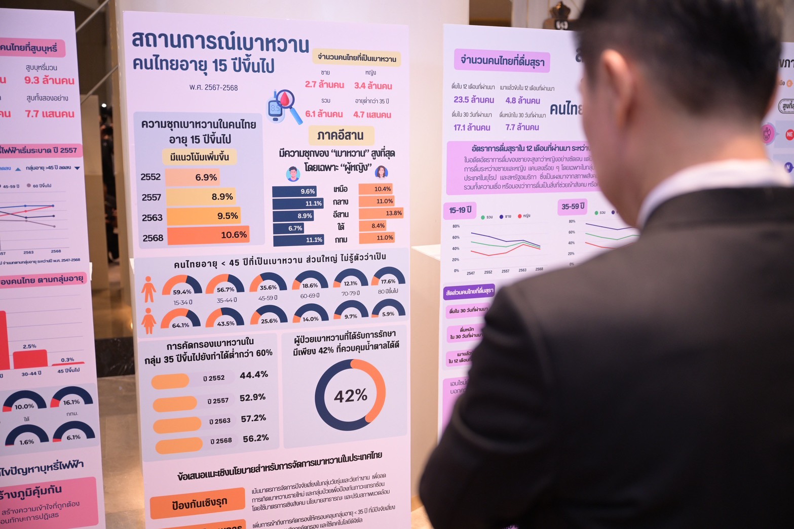 “อย่างกรณีโรคเบาหวานที่มักไม่ค่อยพบในคนอายุน้อย ในกลุ่มอายุ 15-34 ปี หากไม่มีปัจจัยเสี่ยงใด ๆ เลยจะป่วยเบาหวานเพียง 0.3% แต่หากสูบบุหรี่ อ้วน มีไขมันในเลือดสูง และความดันโลหิตสูง จะเสี่ยงเป็นเบาหวานสูงถึง 45.2% และที่น่ากังวลคือ พฤติกรรมเสี่ยงต่าง ๆ ทั้ง สูบบุหรี่ ดื่มสุรา หรือมีกิจกรรมทางกายต่ำ พบว่าในกลุ่มคนอายุน้อยมีแนวโน้มเสี่ยงเพิ่มขึ้นสูงกว่าในกลุ่มผู้สูงอายุ เช่น อัตราการสูบบุหรี่ในกลุ่มอายุ 15-34 ปี เพิ่มสูงขึ้น แต่ในผู้สูงอายุพบว่ามีแนวโน้มการสูบบุหรี่ลดลง ซึ่งเป็นผลมาจากการแพร่ระบาดของบุหรี่ไฟฟ้าที่พุ่งเป้าไปที่กลุ่มเยาวชน โดยพบว่า 70% ของคนสูบบุหรี่ไฟฟ้าในไทยอายุต่ำกว่า 30 ปี”