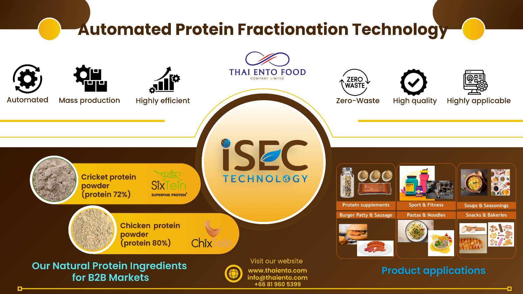 ปัจจุบันมีผลิตภัณฑ์หลักสองชนิด คือ Sixtein (ผงโปรตีนจิ้งหรีด 72%) และ Chixtein (ผงโปรตีนไก่ 80%) ทั้งสองผลิตภัณฑ์มีคุณค่าทางโภชนาการสูง เป็นมิตรต่อสิ่งแวดล้อม และได้รับการรับรองมาตรฐานสากล เช่น GMP, GHP, HACCP รวมถึงกำลังดำเนินการขอ FSSC22000 และ EFSA การต่อยอดงานวิจัยสู่เชิงพาณิชย์ประสบความสำเร็จด้วยการสนับสนุนจาก บพข. ทำให้สามารถผลิตในระดับอุตสาหกรรมได้ถึง 1,200 ตันต่อปี และยังขยายกำลังการผลิตได้มากกว่า 10 เท่า ปักหมุดตลาดเป้าหมาย คือพันธมิตร B2B ทั่วโลก โดยเฉพาะผู้ผลิตอาหารฟังก์ชัน อาหารเสริม กลุ่ม Sports Nutrition และผู้ต้องการวัตถุดิบโปรตีนสะอาดจากธรรมชาติ ซึ่งเป็นตลาดที่มีศักยภาพสูง คาดว่าจะสร้างมูลค่าทางเศรษฐกิจ 1.12–2.25 พันล้านดอลลาร์สหรัฐ ภายในปี 2030 และสร้างงานกว่า 10,000 ตำแหน่ง